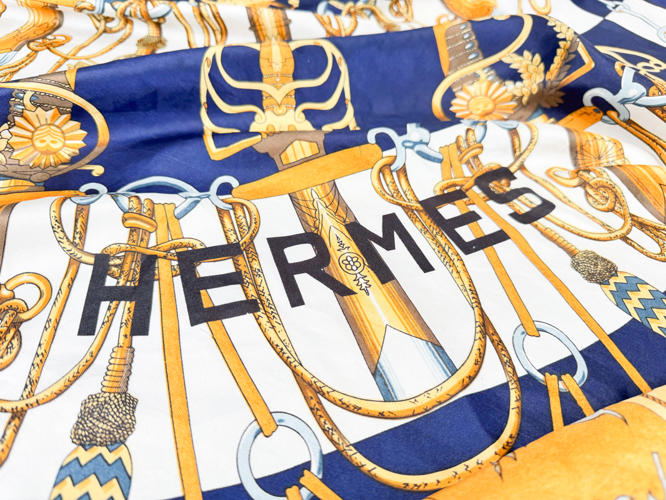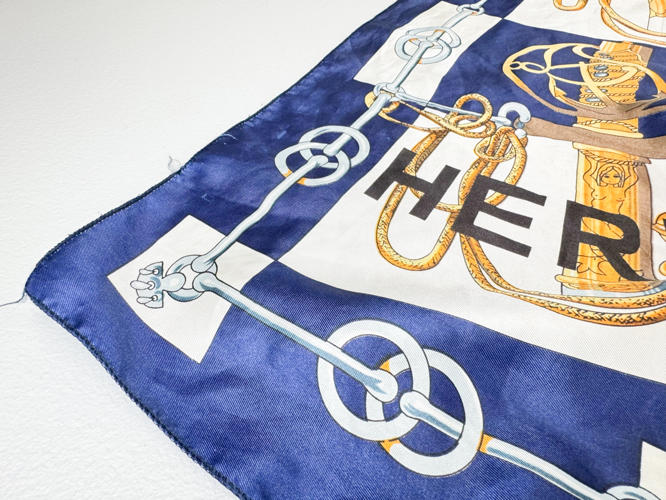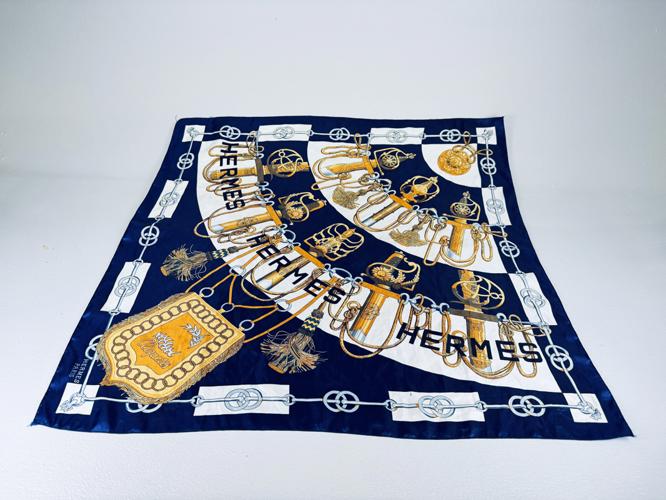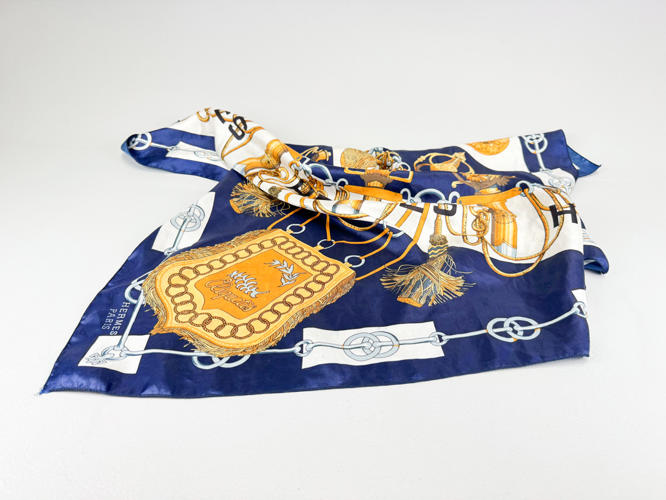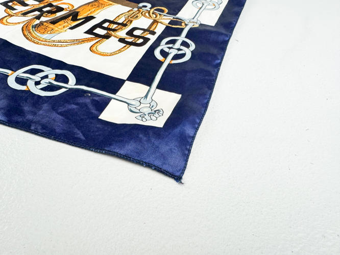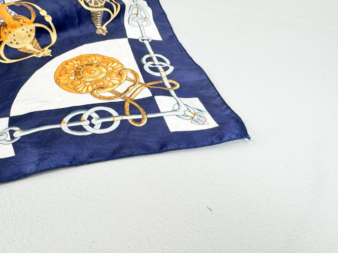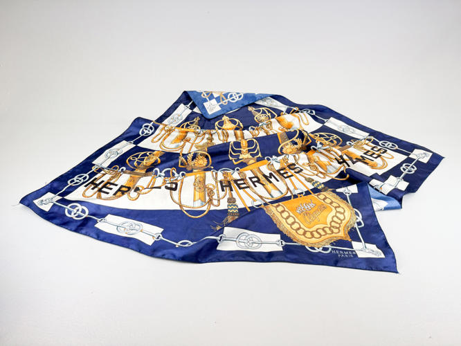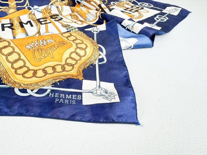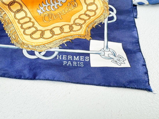 "Cliquetis". Silketørklæde med blå bund. Designet af Julia Abadie i 1972. Fremstår med brugsspor, enkelte pletter samt enkelte løse tråde langs kanter. Ca. 86 x 86 cm.