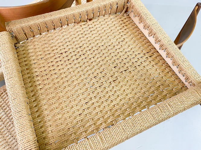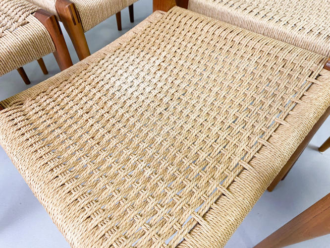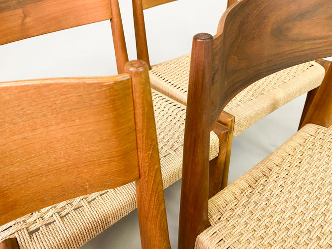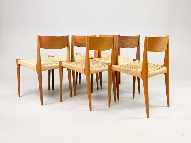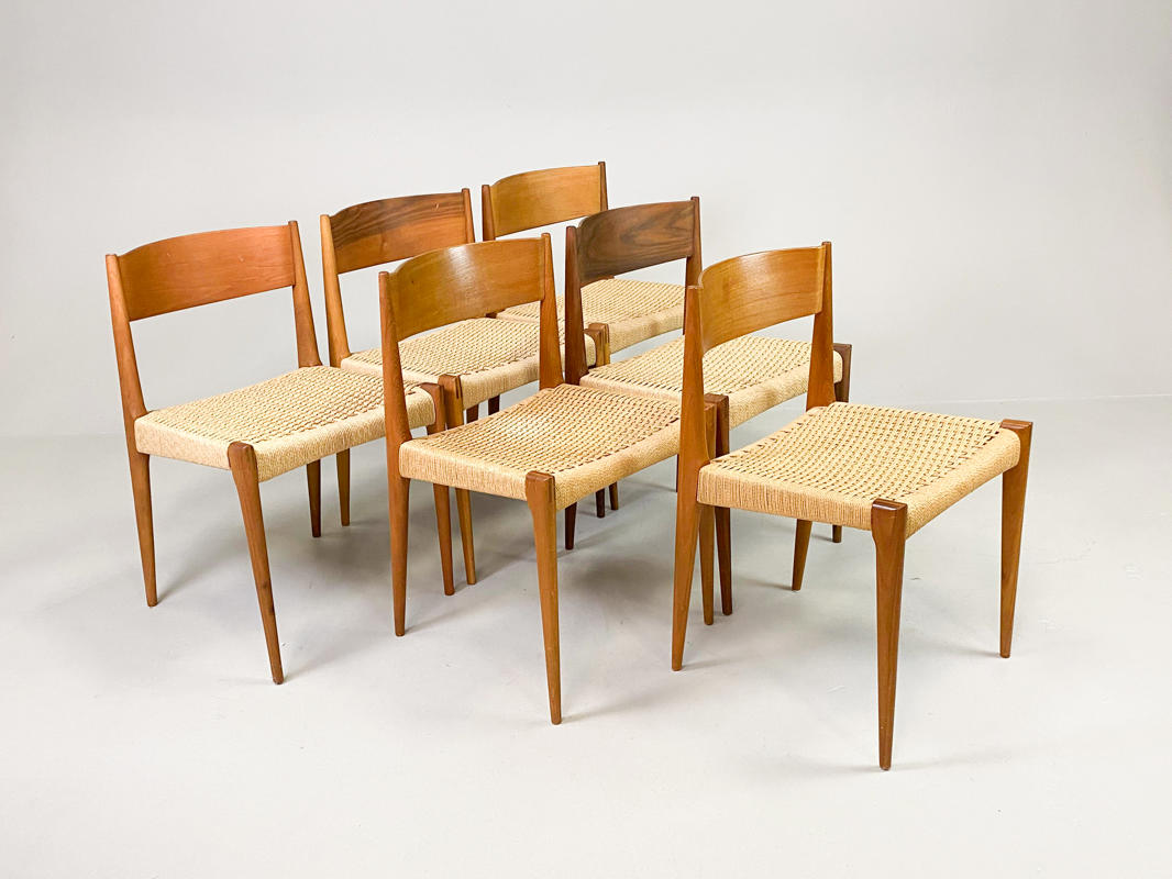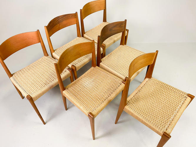 Sæt på 6 stole af teak. Model 'Pia'. 2 med kopstykker af valnød. Sæder fremstår med flettet papirgarn. Produceret hos Cado. Almindelig brugspatina, herunder ridser og mærker.
