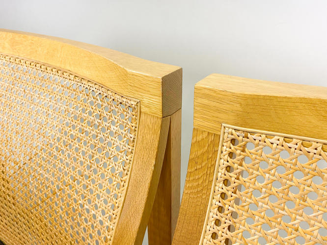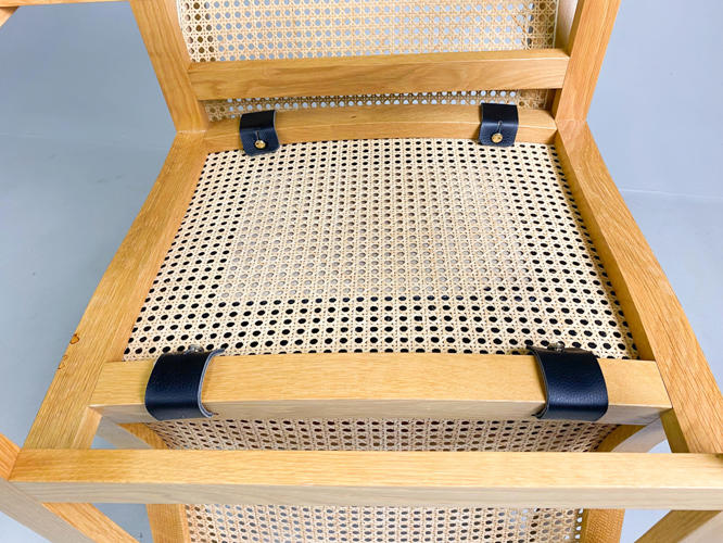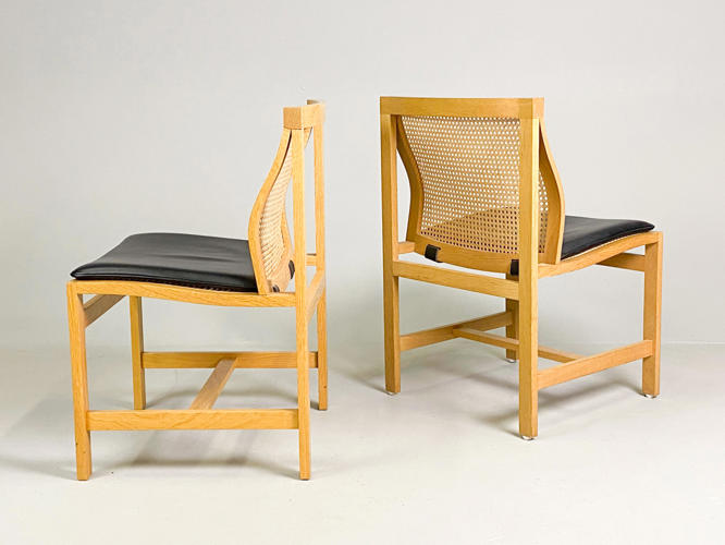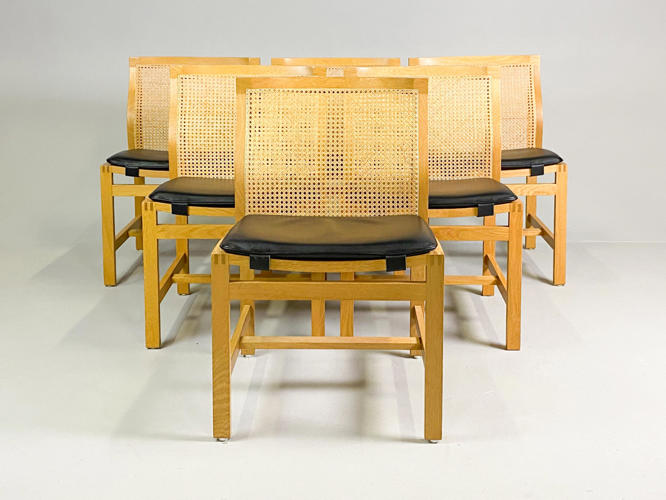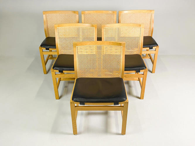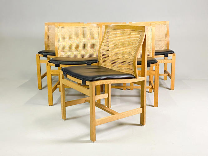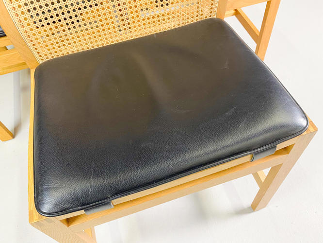 Sæt på seks spisebord stole med stel af egetræ, model Kongeserien, ryg med fransk flet, puder med sort skind, fremstillet hos Botium, en stol med lille afslag på kopstk.