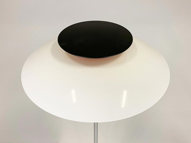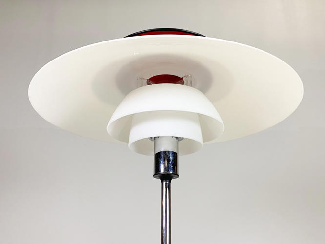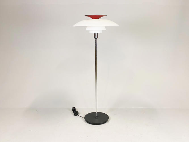 PH80 standerlampe med skærme af akryl, forkromet stamme, monteret på sort fod, afbryder på ledning. Fremstillet hos Louis Poulsen. H. 130 cm. Diam. 55 cm. Fremstår med brugsspor samt ridser og revne på den store skærm.
