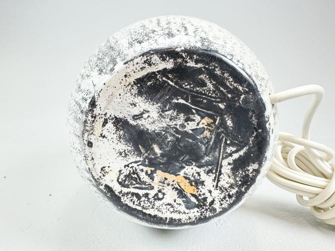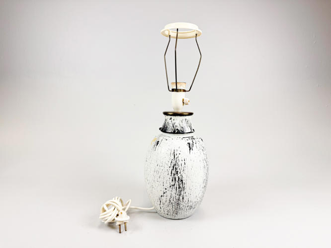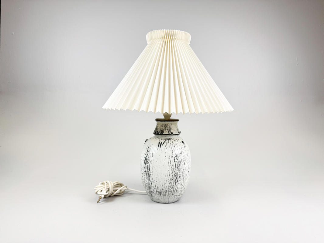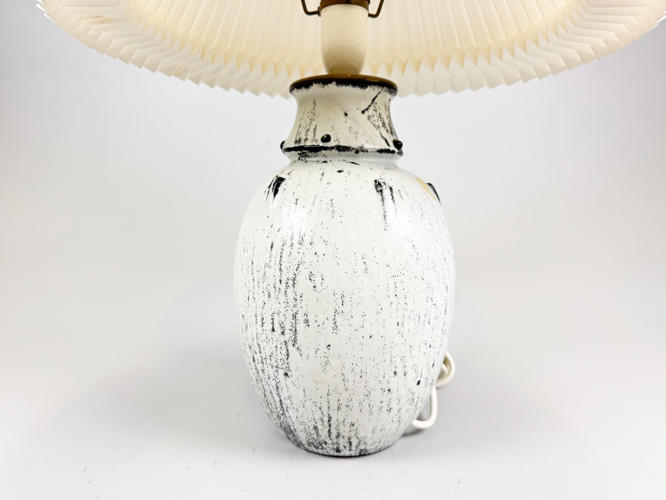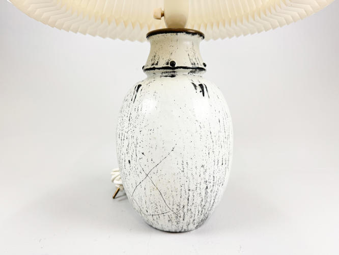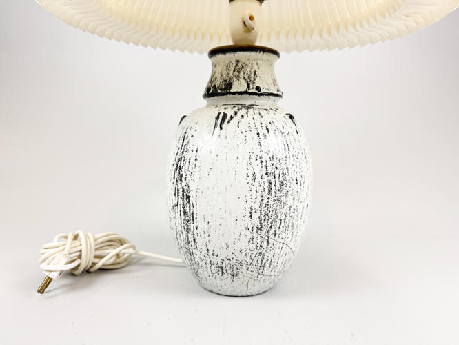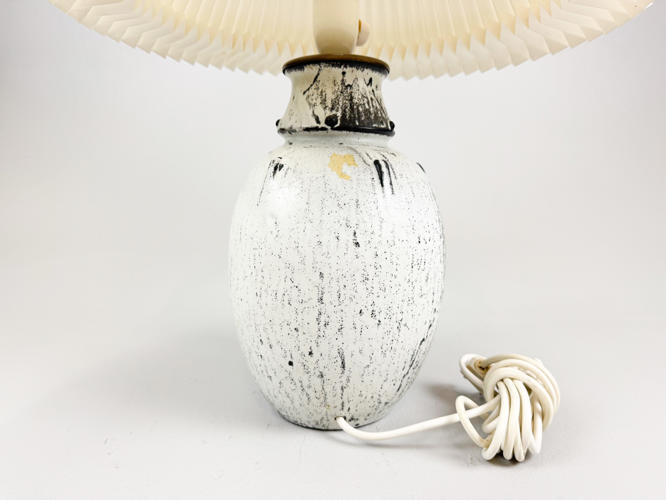 Bordlampe af lertøj. Dekoreret med dobbeltglaseret askeglasur. Mærket HAK. Rester af lael i bund. Med plisseret Le Klint skærm. H. 28/58 cm.