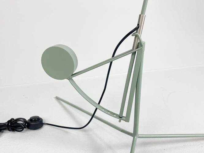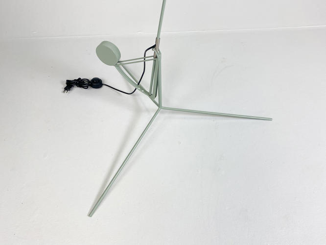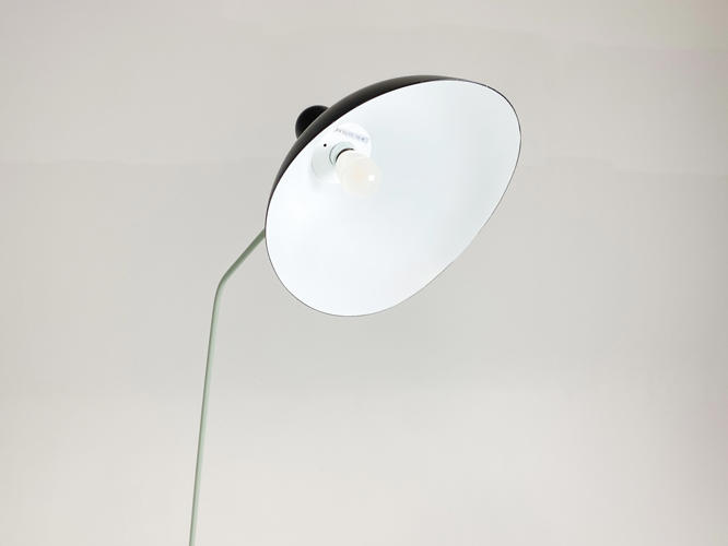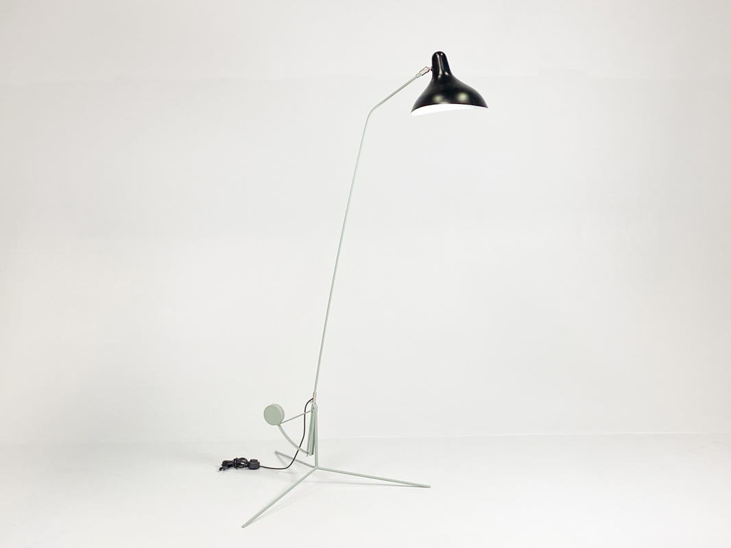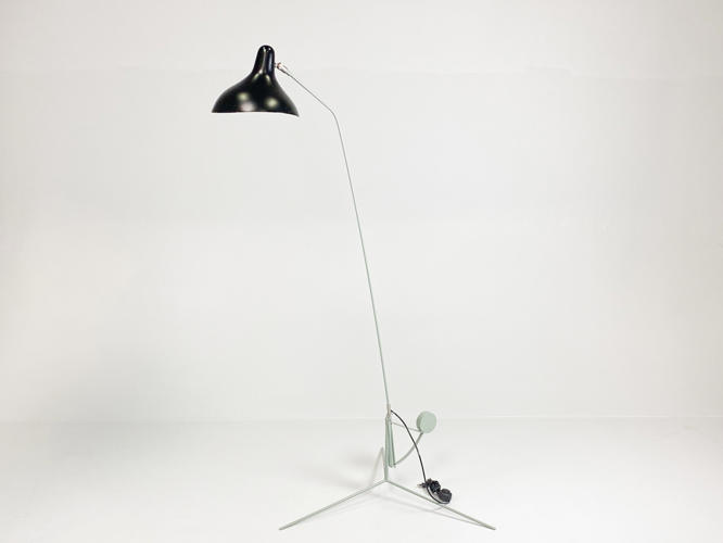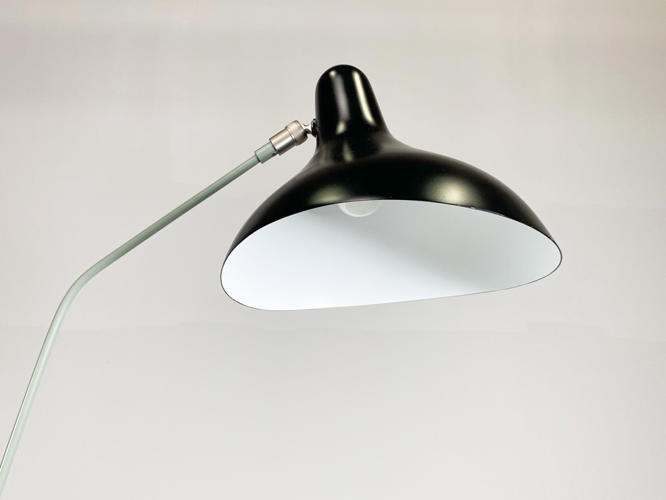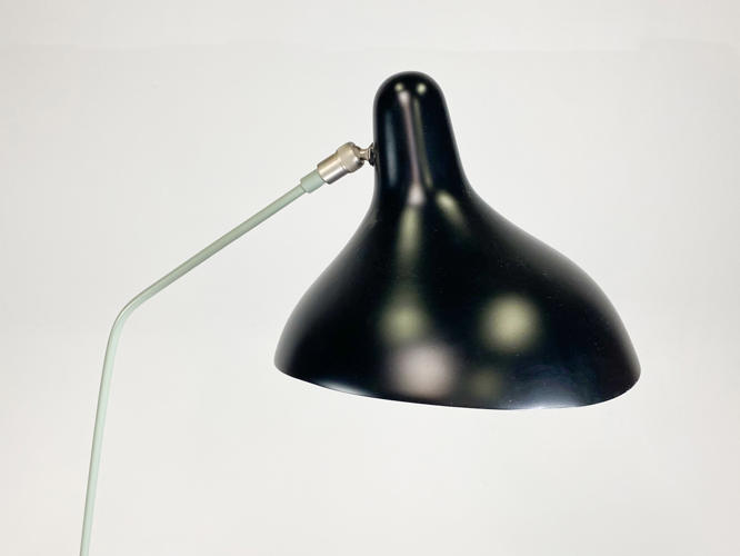 "Mantis BS1" standerlampe. Skærm af sortlakeret metal. Justérbart stel af grønlakeret metal. Designet i 1951. Produceret for La Lampe Gras. Armen kan justeres i 4 positioner, drejes 360°, og lampehovedet, der kan vippes 27 grader.