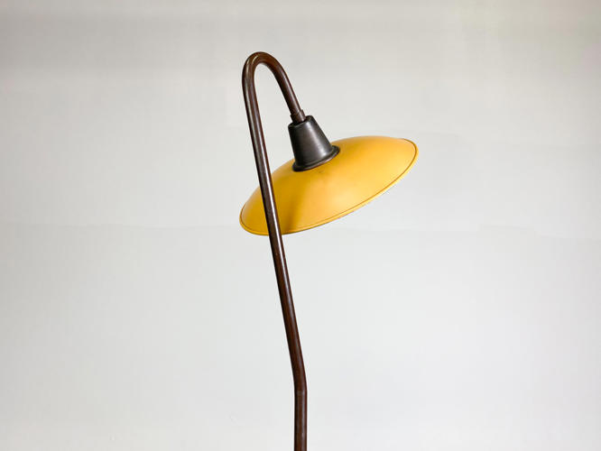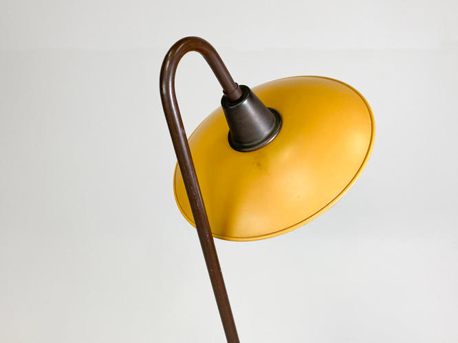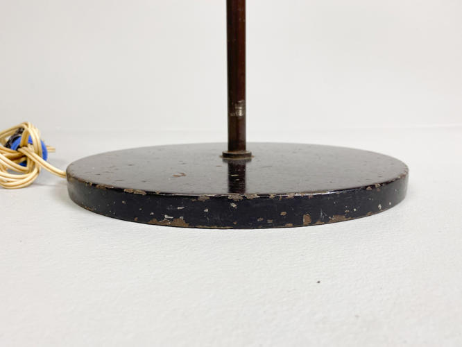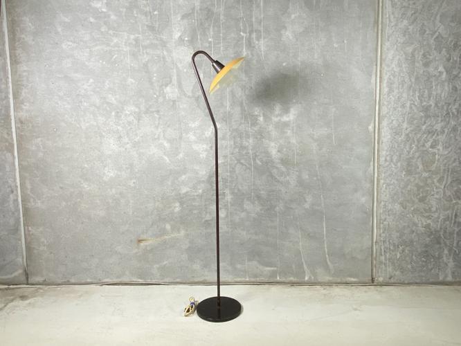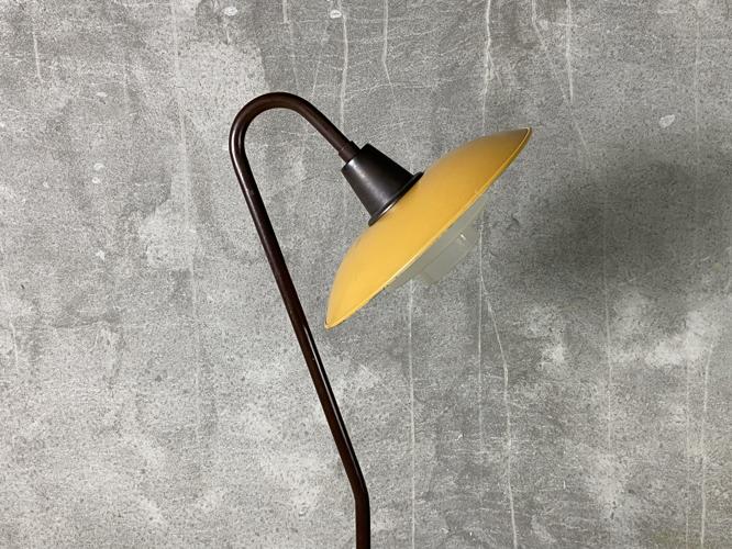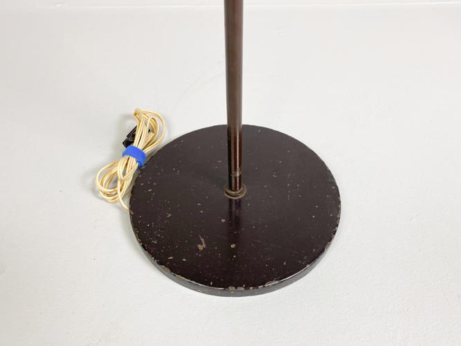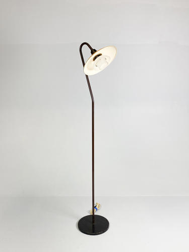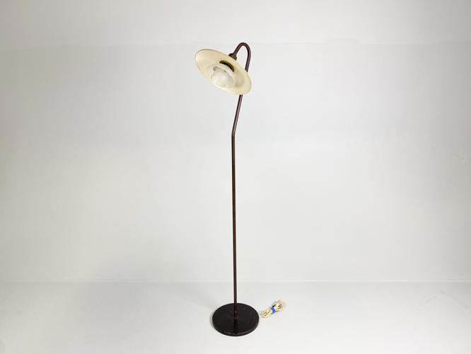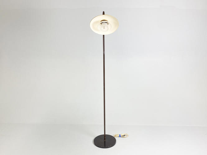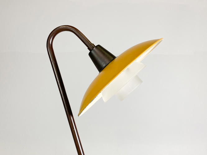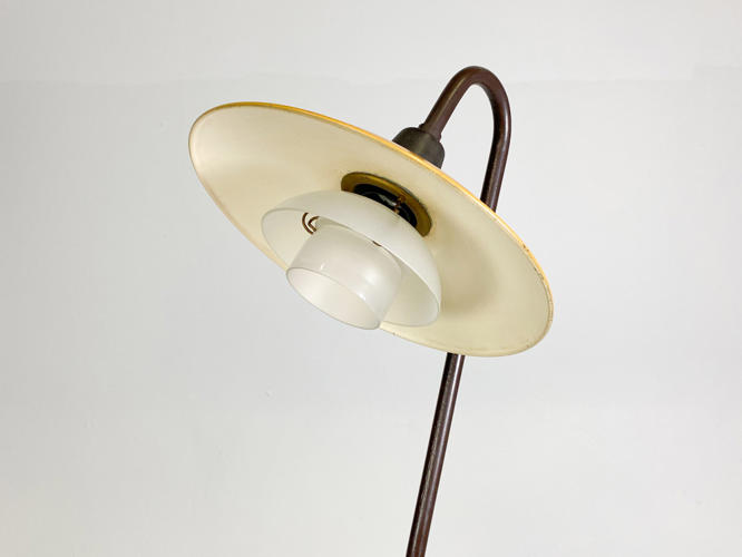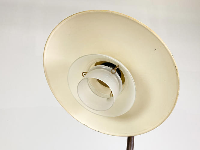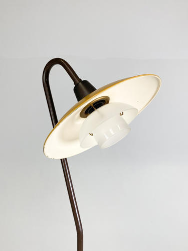 “PH-Syvtallet”. Gulvlampe med stel og fatningshus af ducolakeret metal. Skråtstillet stel med højt knæk. Monteret med 3/2 skærmsæt. O-skærm af gullakeret metal. M- og U-skærm af matteret glas. H. 149 cm. Produceret hos Louis Poulsen, 1940'erne. Fremstår med afskalninger på fod samt på kant af O-skærm.