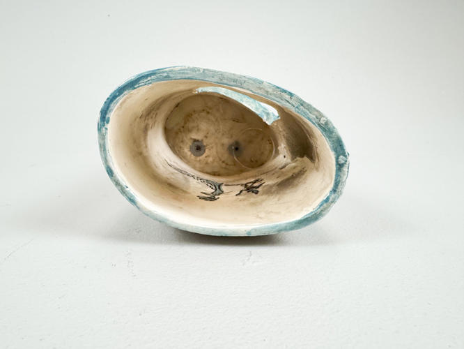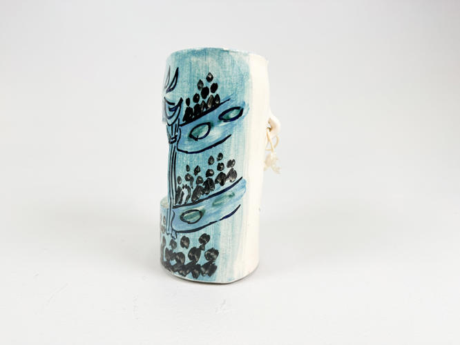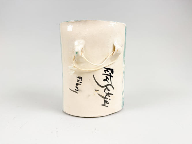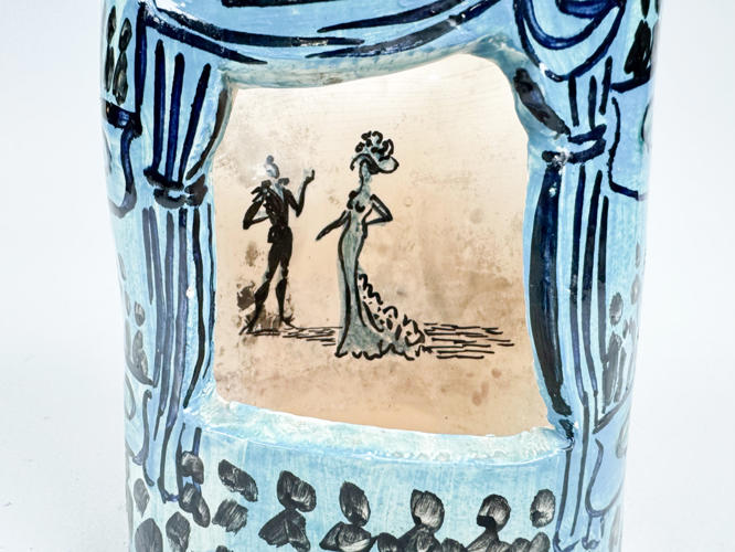 Vægstage i form af teater. Glaseret keramik. Dekoreret med blå farver. Indvendig "bag tæppet" med kurtiserende par. Signeret Peter Sekjær Fåborg på bagside. H. 18 cm. D. 9 cm. B. 13 cm.