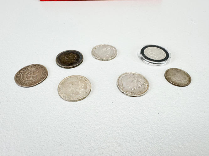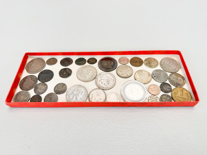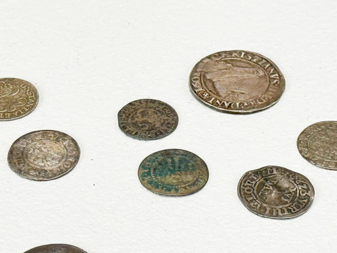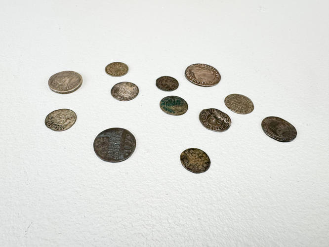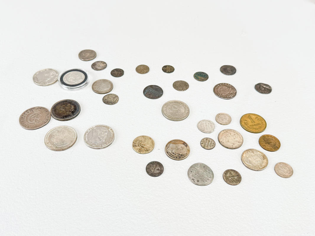Christian IV 1644 2 mark. Christian IV 1624. Christian IIII 1608 1 mark. 1702 Reichsthaler. 1718 Skilling. 4 Scoldi Genoa m.m. I alt 31 mønter, hovedsageligt Danmark.