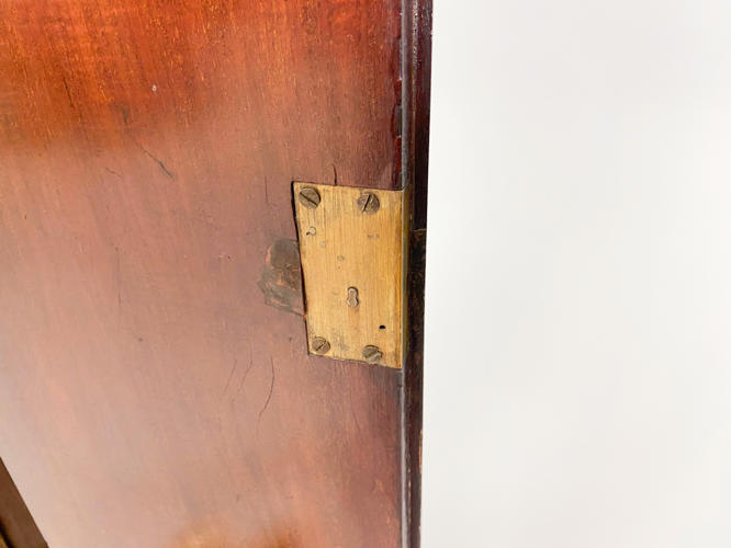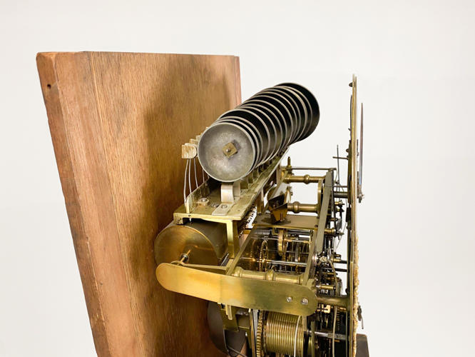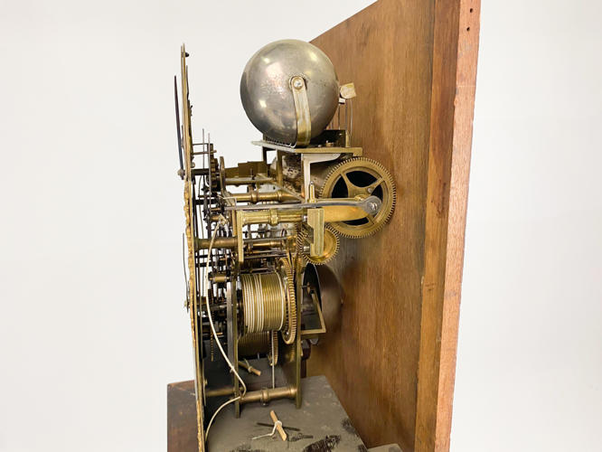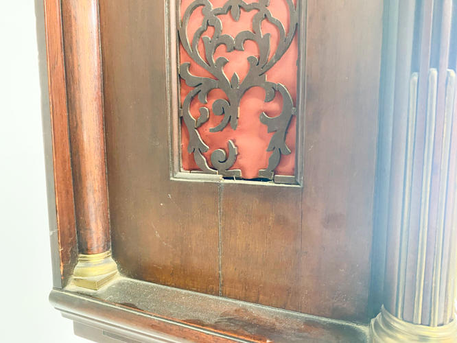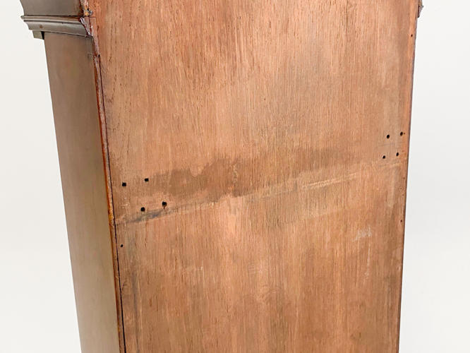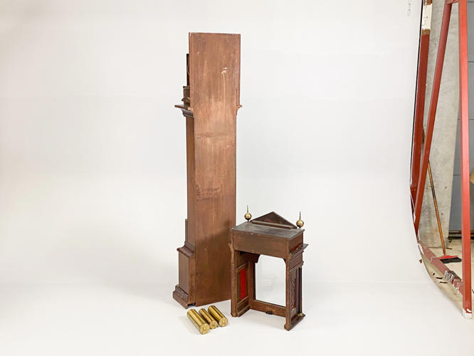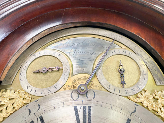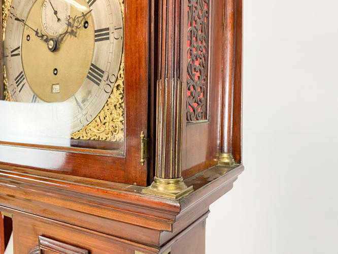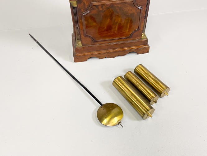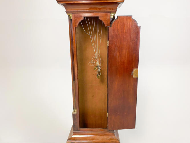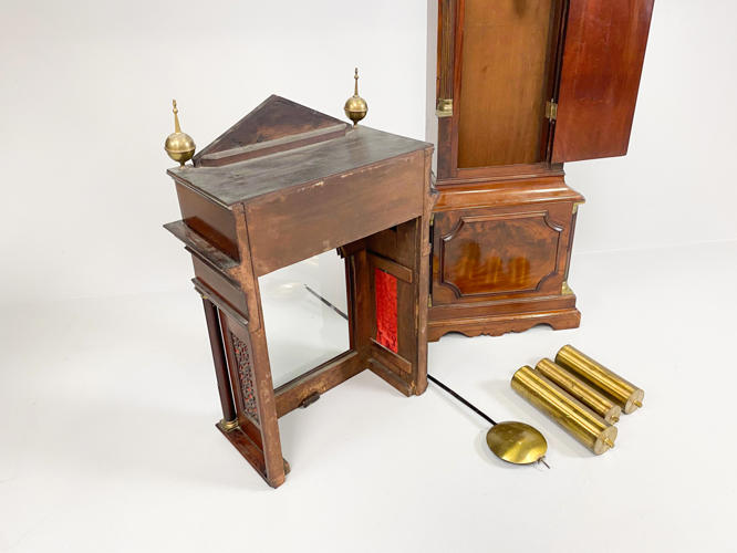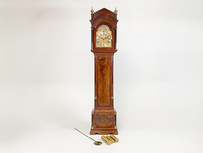 Kasse af mahogni. Dekoreret med helsøjler. John Cannon London-urværk med spilleværk og 8-døgnsværk. 3 lodder, nøgle og pendul kassenøgle medfølger, værknøgle medfølger ikke. Bagplade senere udskiftet. H. 236 cm.