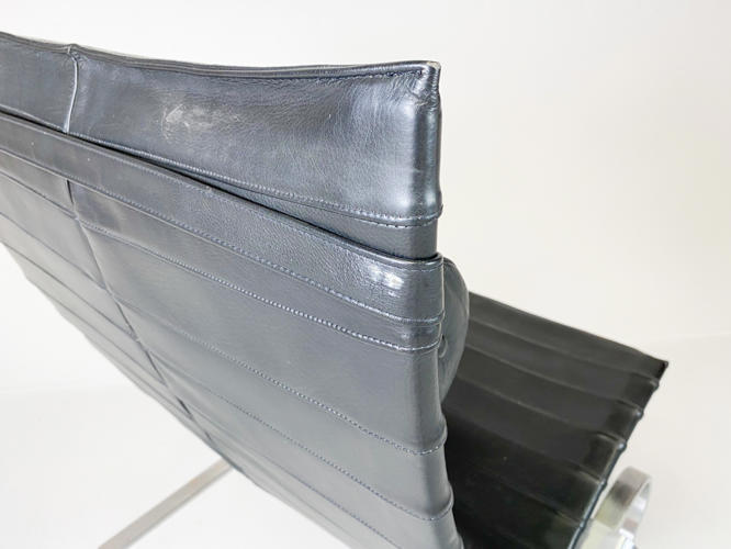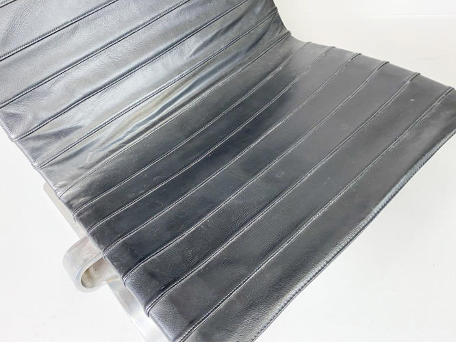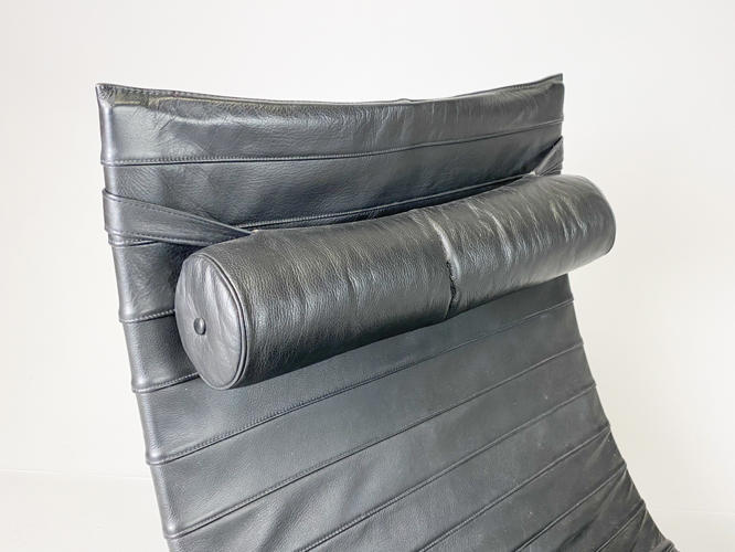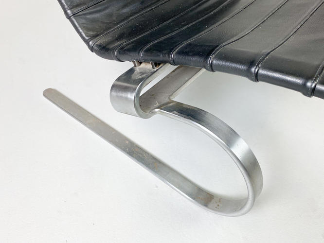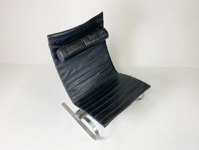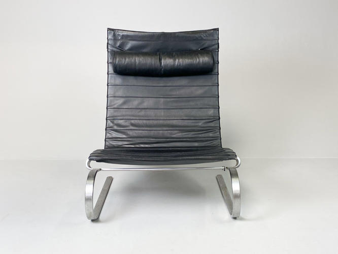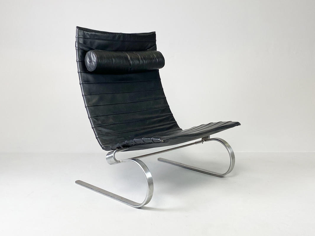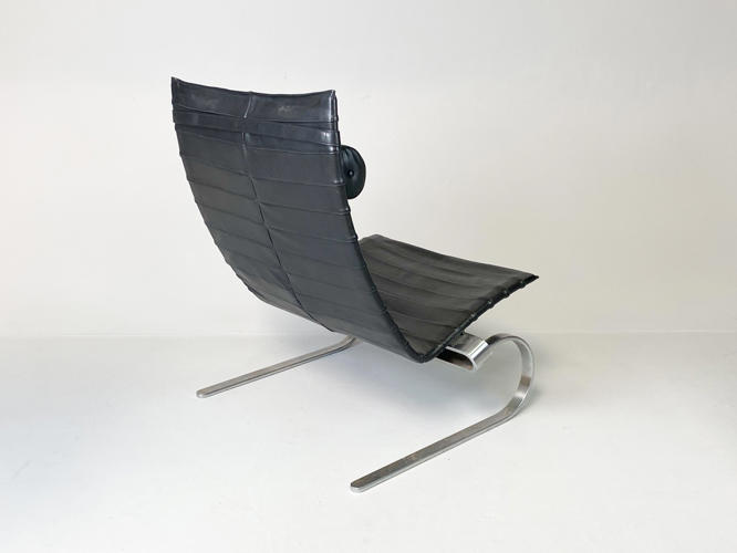 “PK-20”. Lænestol med stel af matforkromet fjederstål. Sæde og ryg samt nakkepude betrukket med sort banesyet patineret skind. Formgivet i 1968. Udført og mærket hos Fritz Hansen 1987. Fremstår med alders- og brugsslitage, herunder ridser og mærker. Rust på stel. Skind med pletter, smuds og mindre krakeleringer.