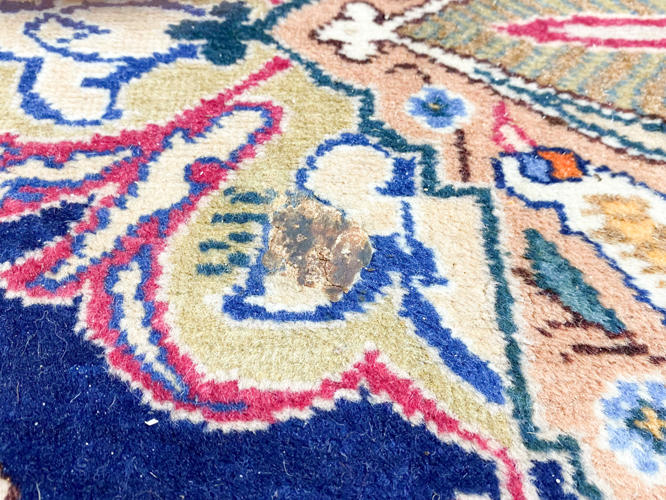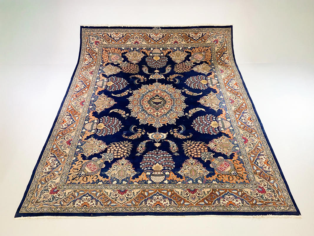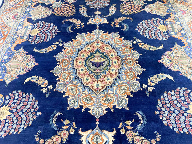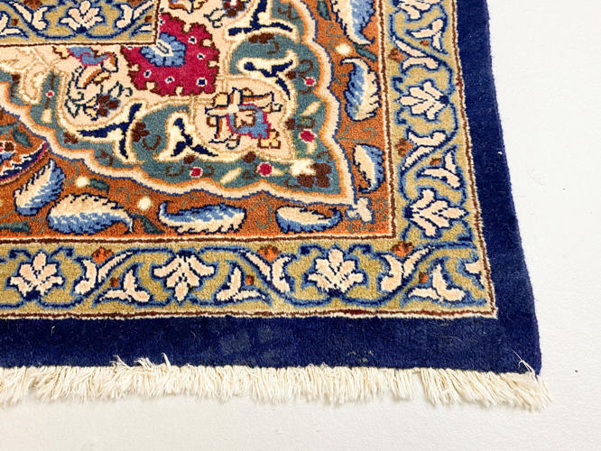 Uld knyttet på bomuld. Medaljon design på mørk blå bund. Brugsspor. 299 x 392 cm.