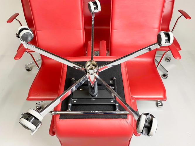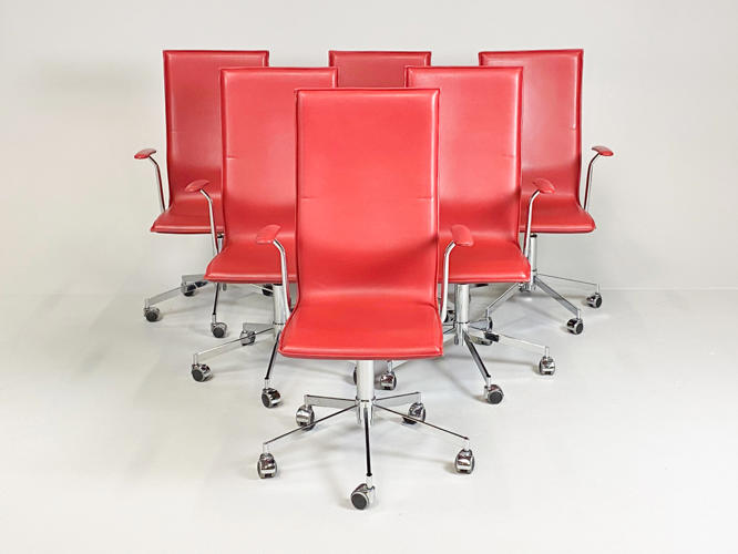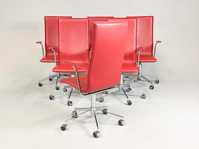 6 kontor / konferencestole betrukket med rødt skind, drejelig fempasstel af forkromet metal med returdrej, afsluttet på hjul. Sh. 45 cm. Fremstår med få brugsspor.