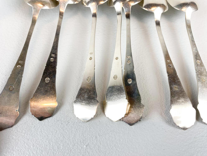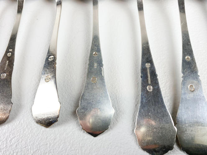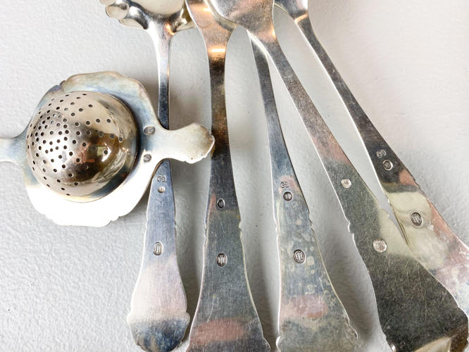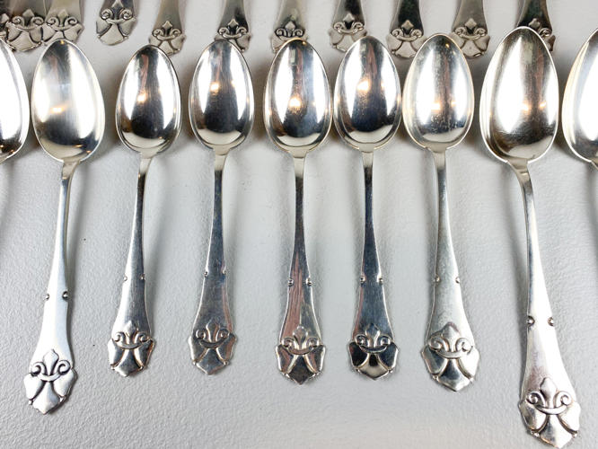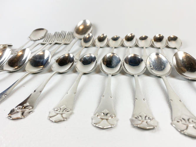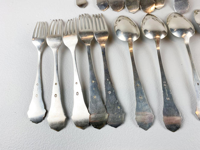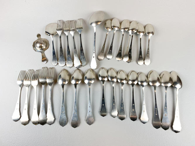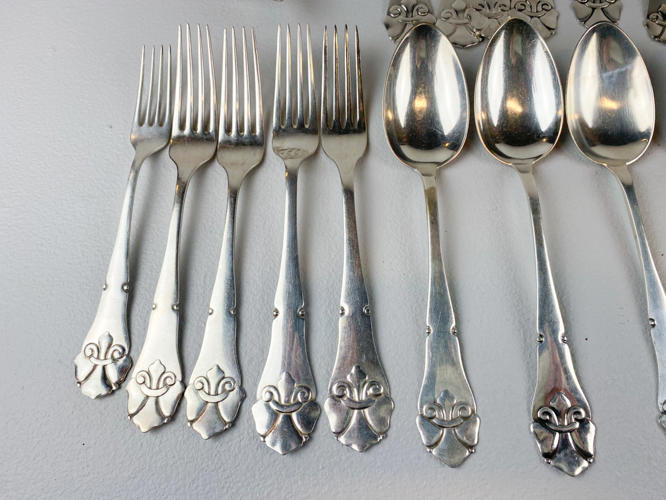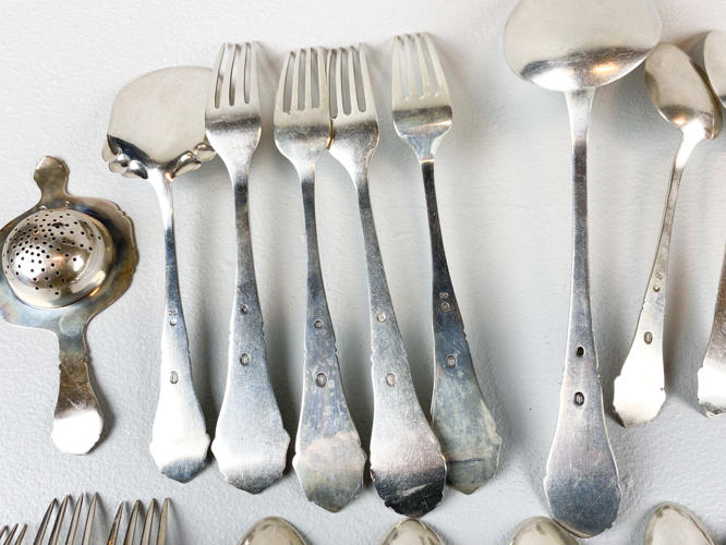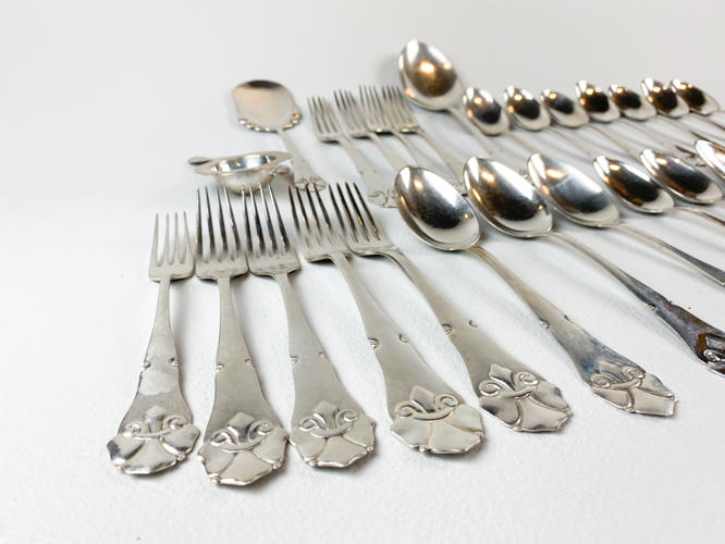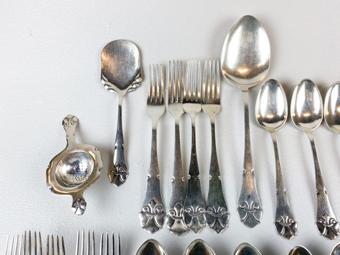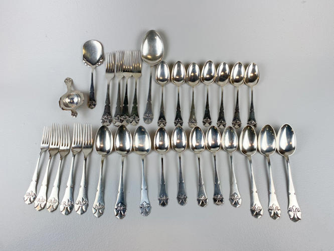 Dele til bestikservice af sølv, stemplet tre-tårne, bestående af, 8 gafler, frokostgaffel, 6 skeer, 12 dessertskeer, kartoffelske, tesi samt kagespade, fremstår med brugsspor, samlet vægt ca. 1160 gr.