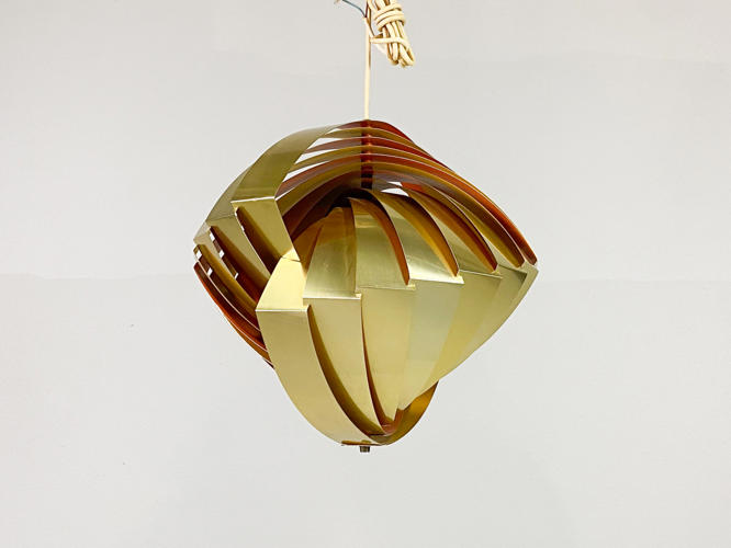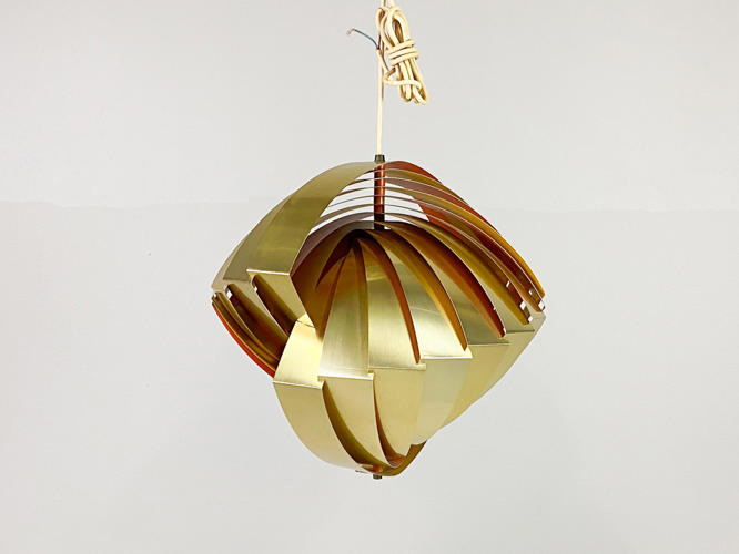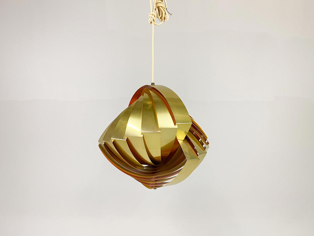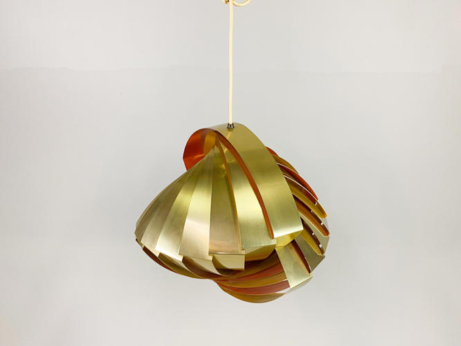 “Konkylielampe”. Pendel af messing, indvendig med røde- og orangelakerede lameller. Model P483. Formgivet 1967. Udført hos Lyfa. H. 38. Diam. 40.