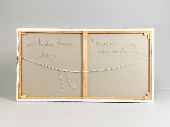 "Bedstefar tag dine tænder på". Signeret og betitlet på revers. Akryl på lærred. 70 x 130 cm.