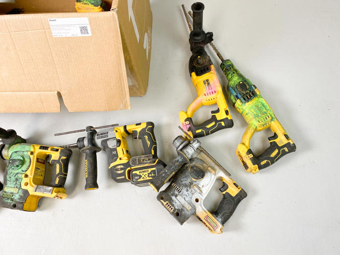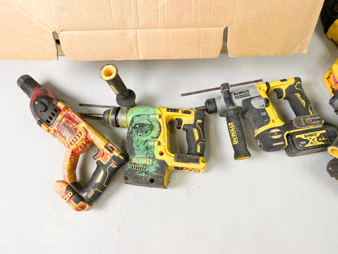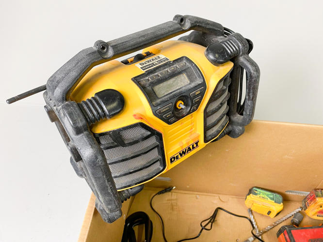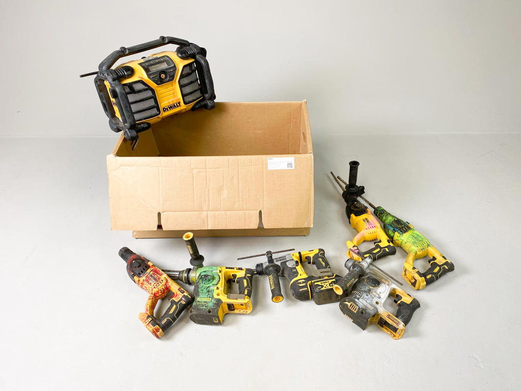 Radio, 6 slagboremaskiner med 6 batterier. Med brugsspor og malingrester. Der garanteres ikke for funktionalitet.