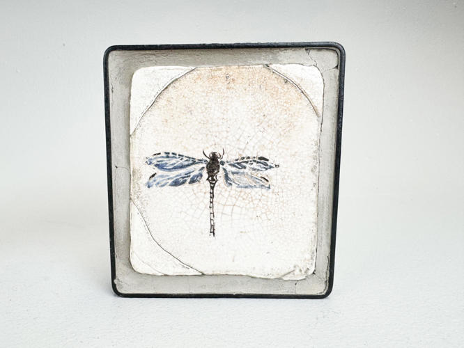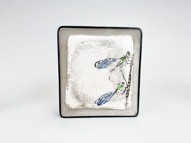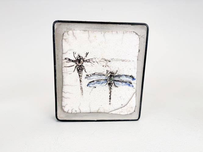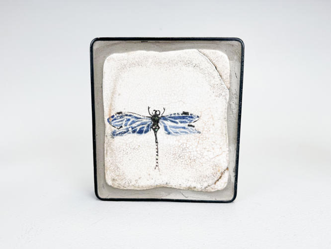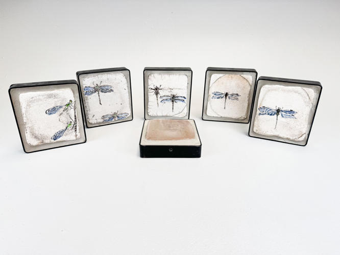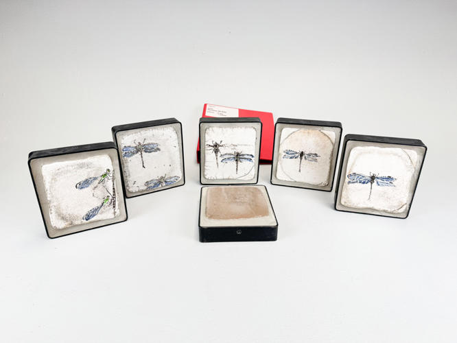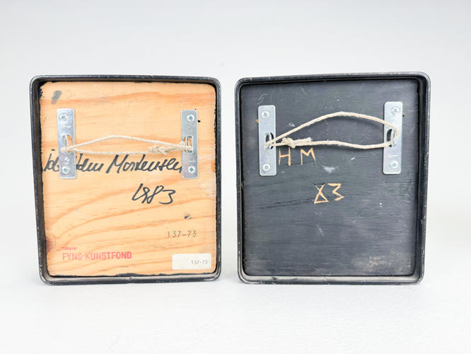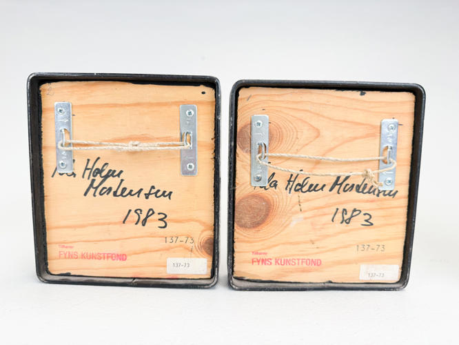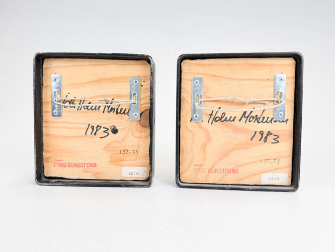 6 små relieffer af rakukakler indsat i jernrammer. Dekoreret med guldsmede. ca. 15 x 14 cm. Dias fra værksted medfølger. Auktion over kunstværker og kunstgenstande fra Odense Kommune.