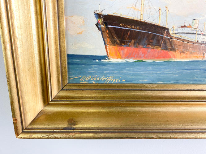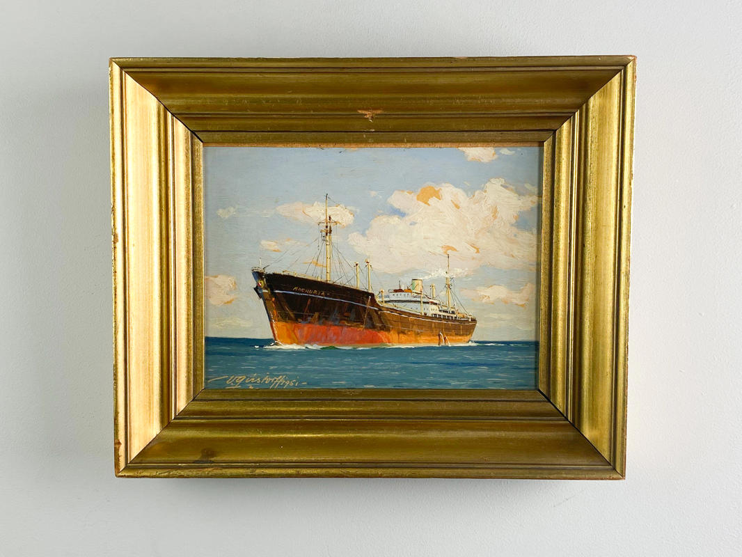 Marine med skibet Manchuria. Signeret og dateret 1951. Olie på lærred. 17 x 22 cm. M. Bygget til Det Østasiatiske Kompagni (ØK), leveret i 1945, som opererede på Indien-ruten indtil 1969.