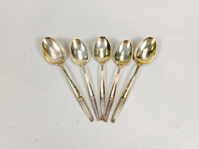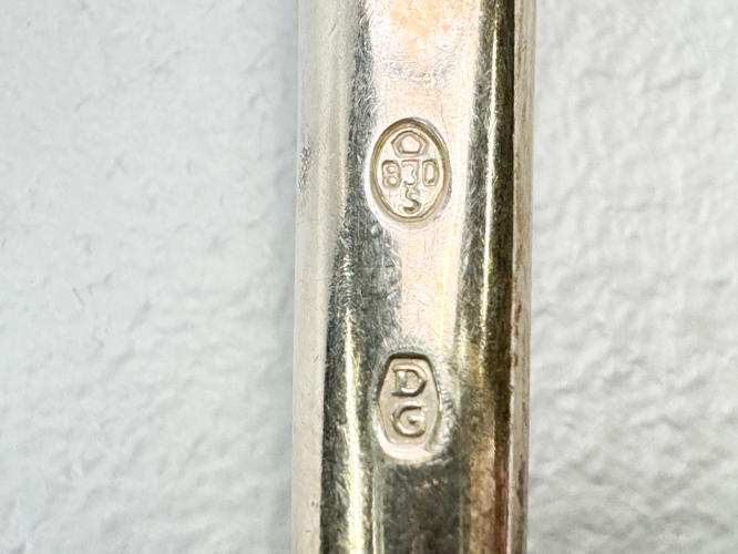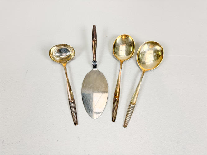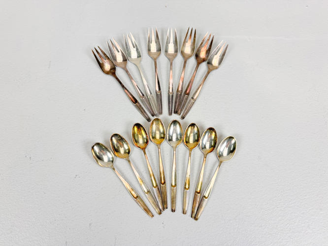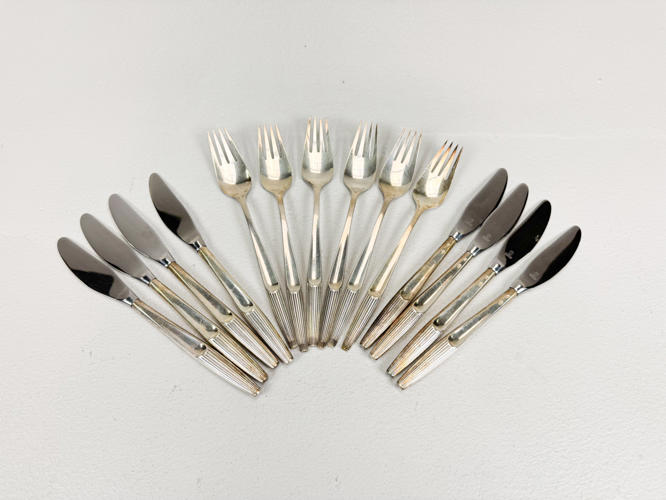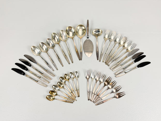 Eva bestikservice af sølv, stemplet 830, bestående af,8 middagsknive, 6 middagsgafler, 2 middagsskeer, 3 dessertskeer, 8 kagegafler, 8 kaffeskeer, 2 opøserskeer, soveske samt kagespade. Vægt uden 9 dele med stål ca. 868 g.