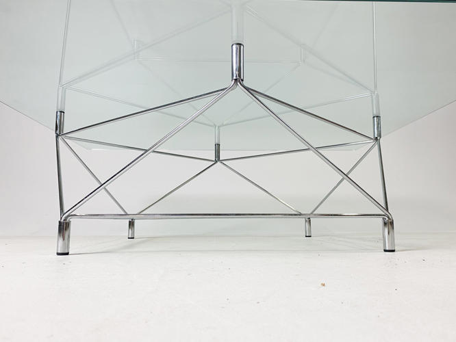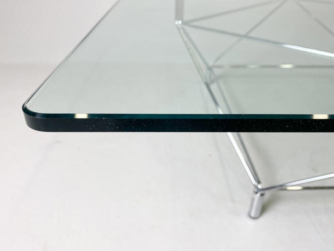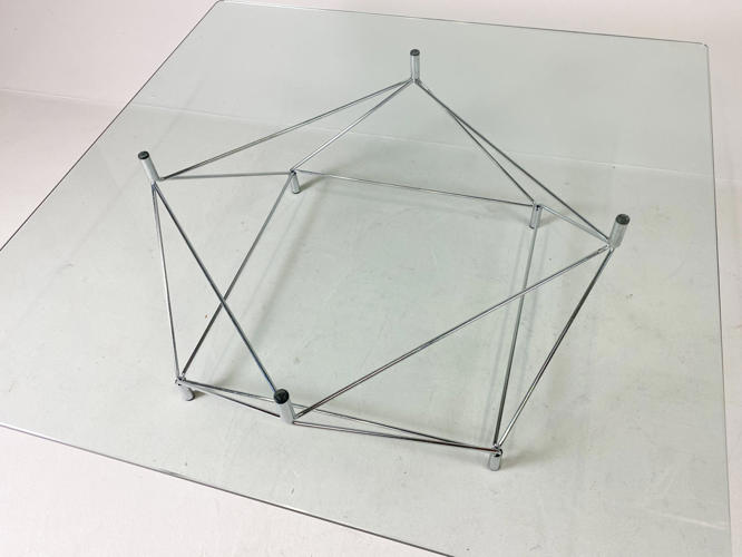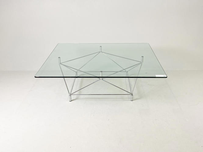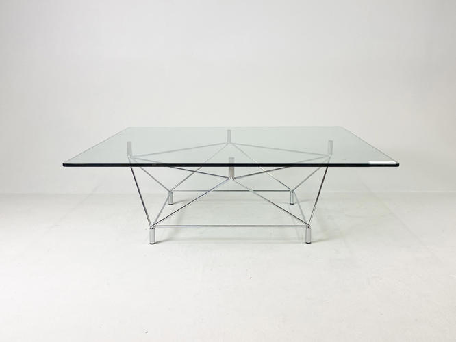 Sofabord, model Spider, med kvadratisk plade af klart glas, opsat på stel af forkromet stål, model Spider, H. 39 B. 120. D. 120 cm. Formgivet 1991. Fremstillet hos Eilersen. Fremstår med minimale brugsspor.