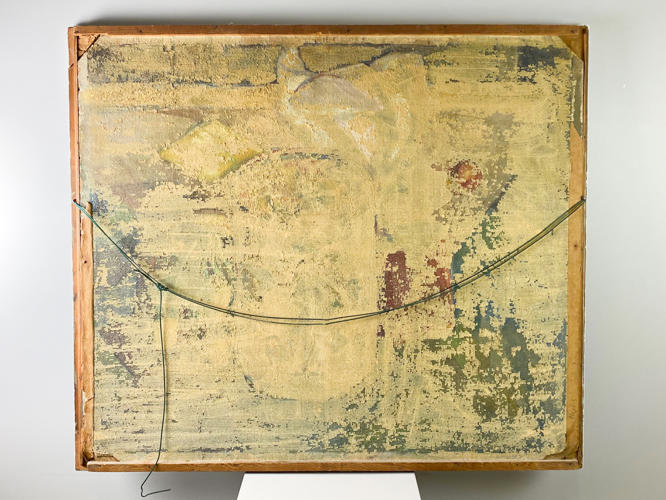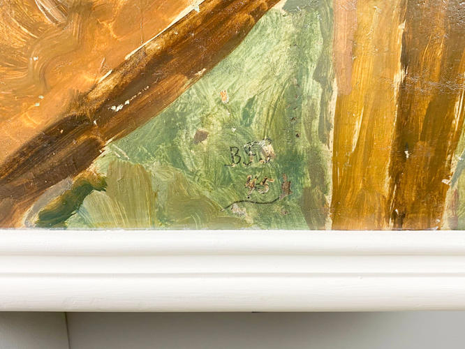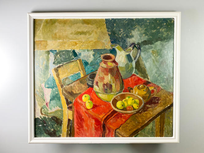 Opstilling på bord med frugter og æbler. Signeret BF '45. Olie på plade. 99 x 116 cm. Fremstår med små afskalninger.