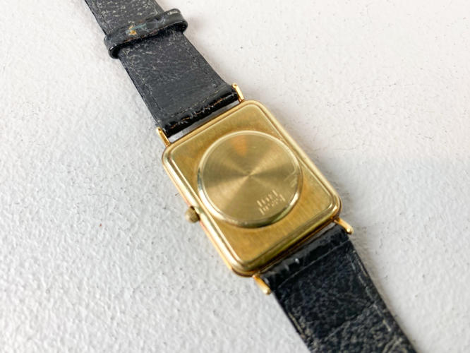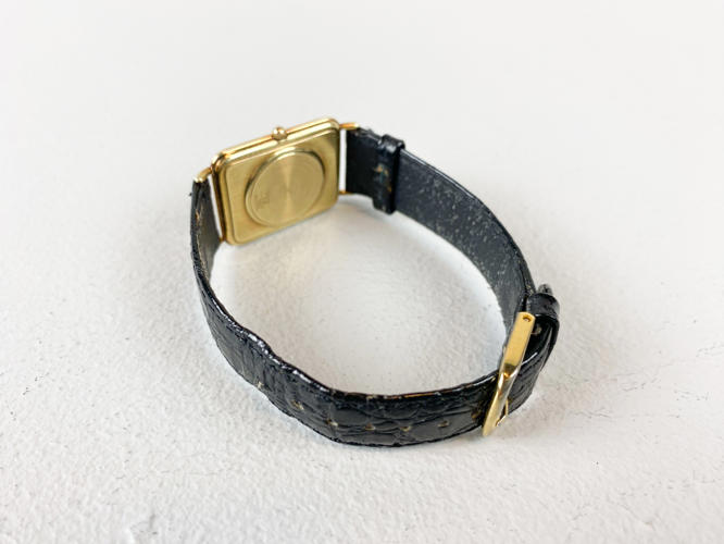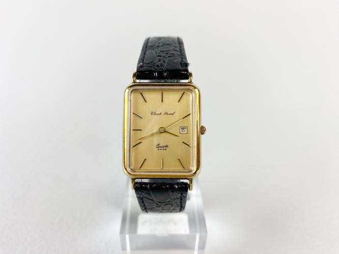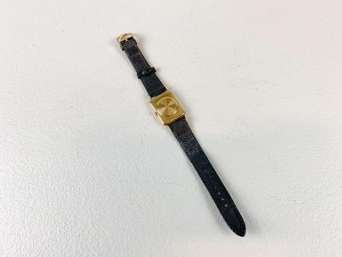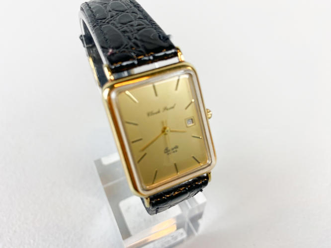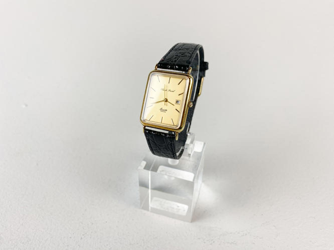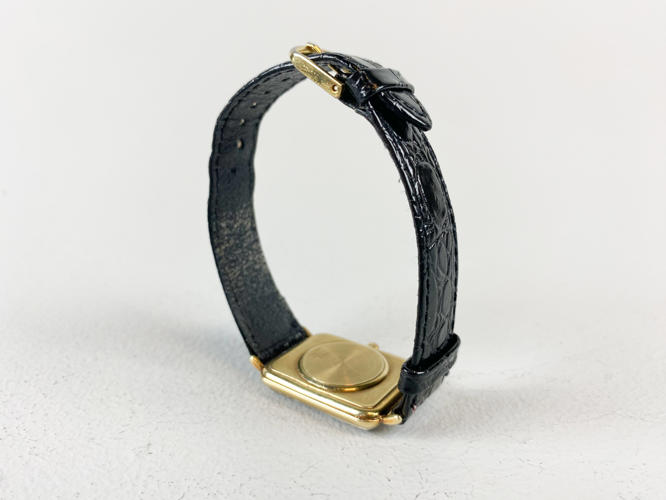 Armbåndsur med kasse af 14 K. guld, stemplet 14 K samt 585, quarts værk med datovisning, champagnefarvet skive, monteret med senere rem af kroko præget skind, 25 x 30 mm., urets samlede totalvægt ca. 17,5 gr., uret gik under eftersyn, der garanteres ikke for funktionalitet.