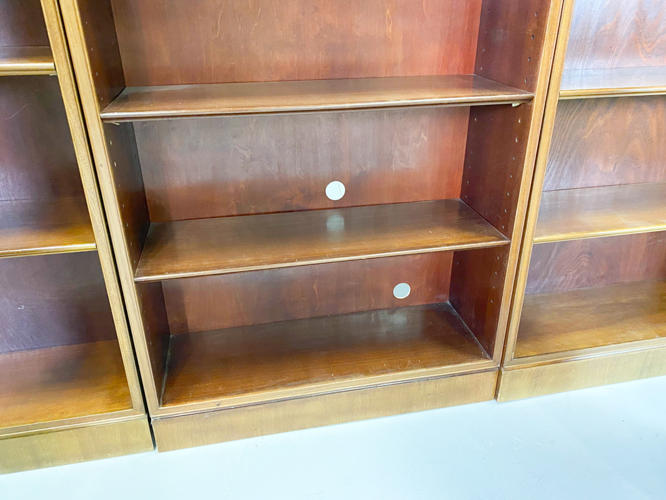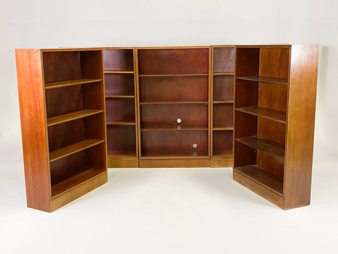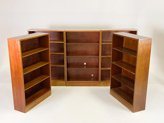 Sæt på 5 reoler / bogkasser af mahogni med profilerede kanter. Udført hos snedkermester Frits Henningsen. H. 125. B. 75. D. 25 cm.