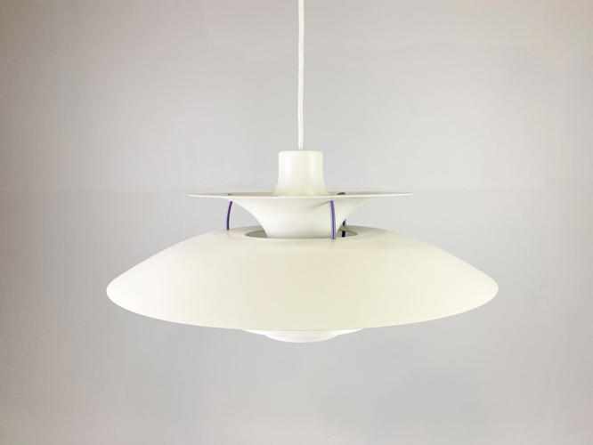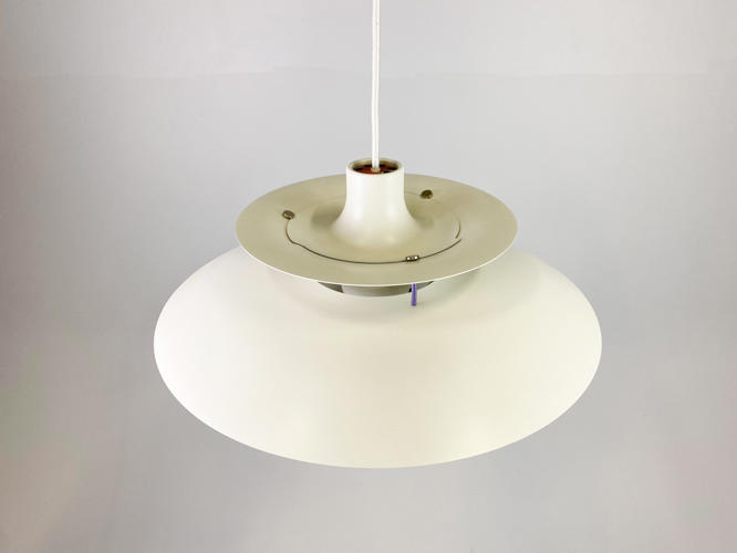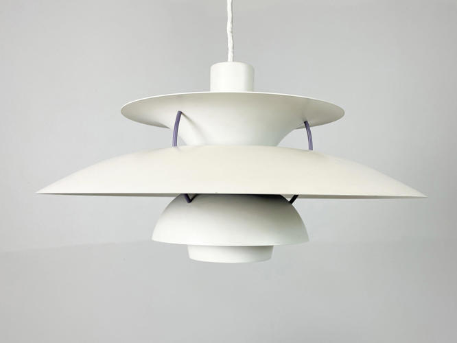 PH5 loftsbelysning, hvidlakeret metal, produceret hos Louis Poulsen.