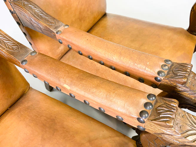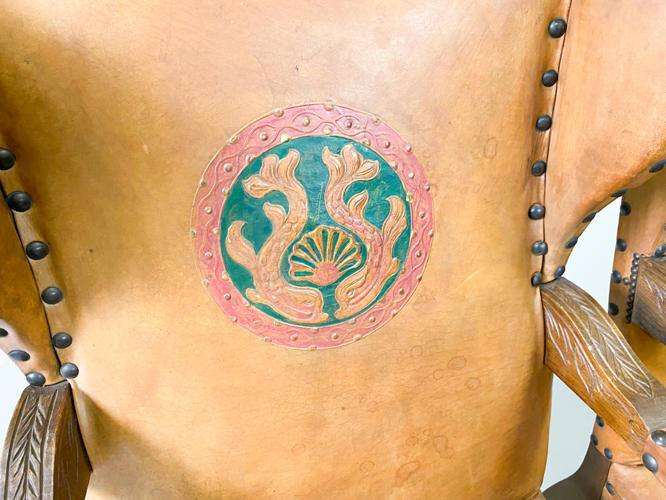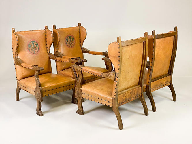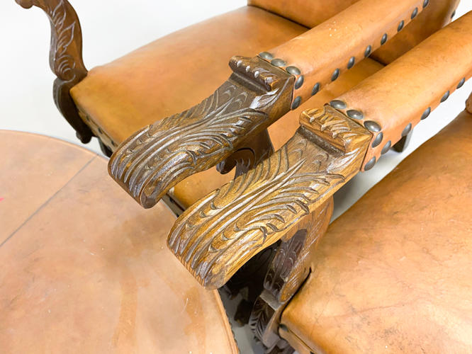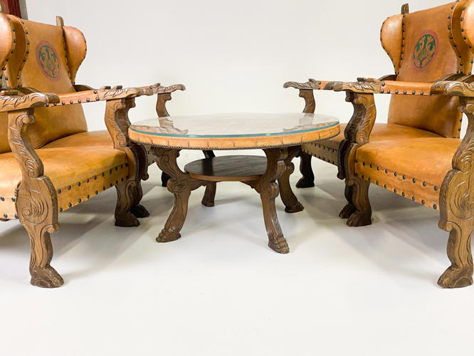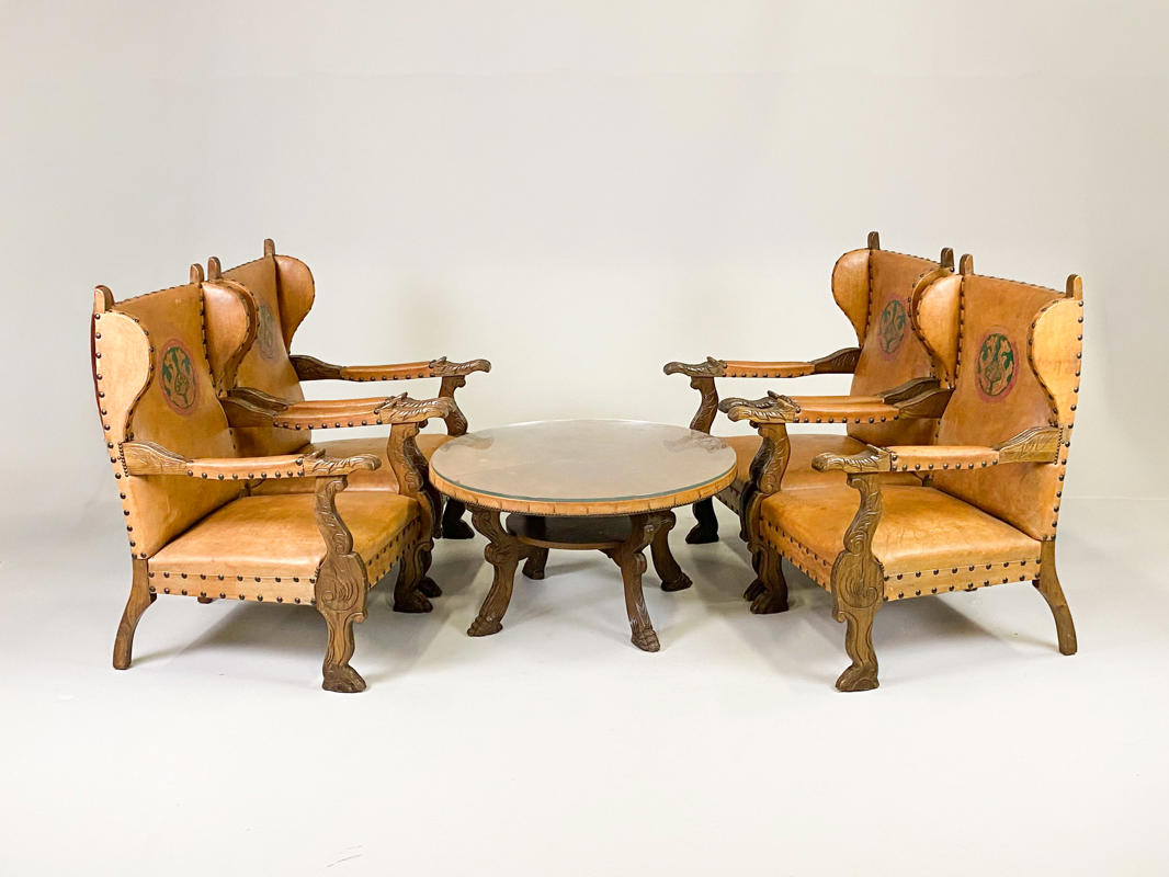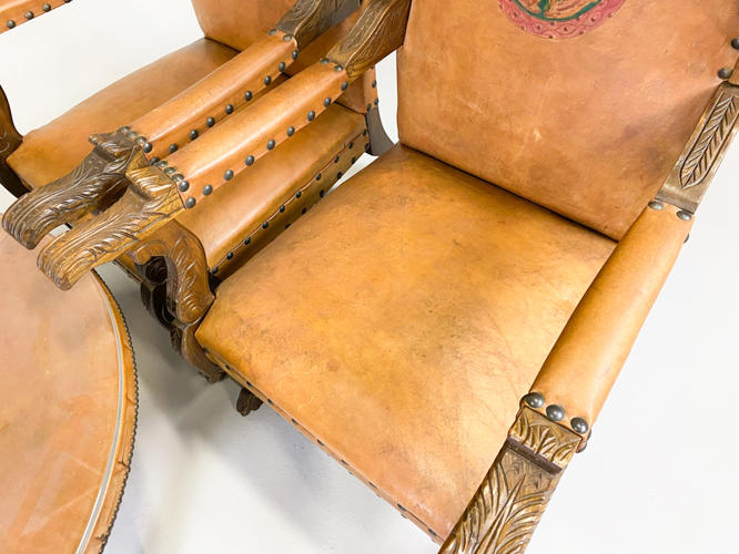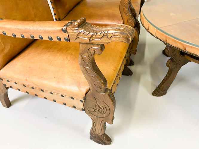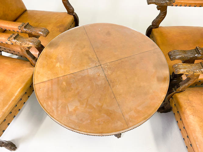 Stel af udskåret egetræ, beklædt med præget skind, rundt bord ligeledes beklædt med skind medfølgende, fremstår med enkelte afslag samt slid, diam. 90 cm., h. 49 cm.