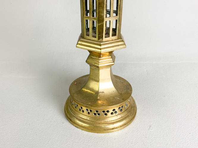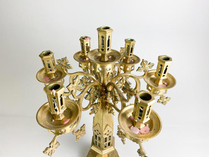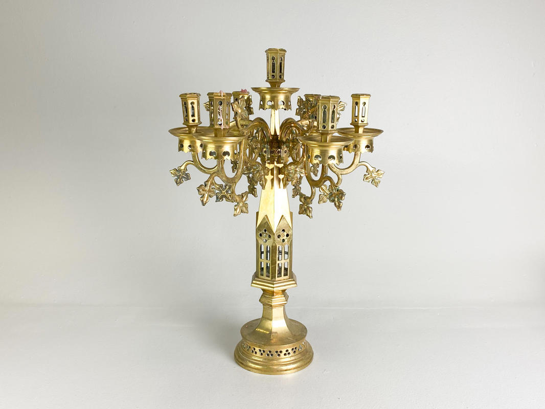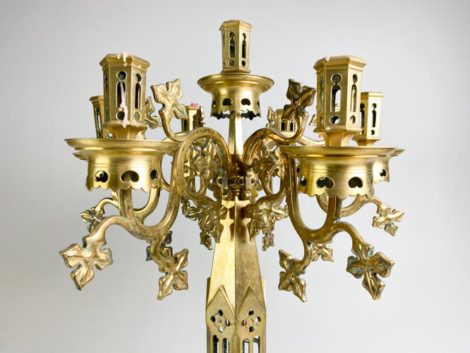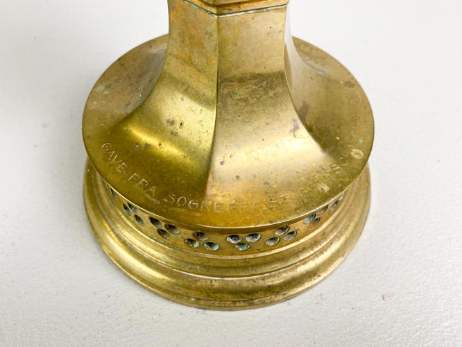 Patineret bronze, korpus med gennembrudt ornamentik, monteret med 7 lysarme dekoreret med bladværk, graveret: gave fra sognepræst Gottschalck-Hansen og hustru 25 august 1911, h. 70 cm., diam. 48 cm.