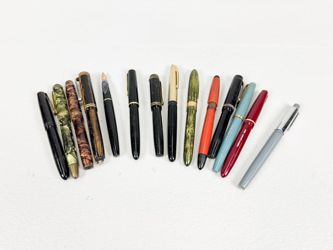 14 Fyldepenne hovedsageligt med spidser af 14 K. guld, stemplet og ikke stemplet, fremstår med defekter samt slid og brugsspor.