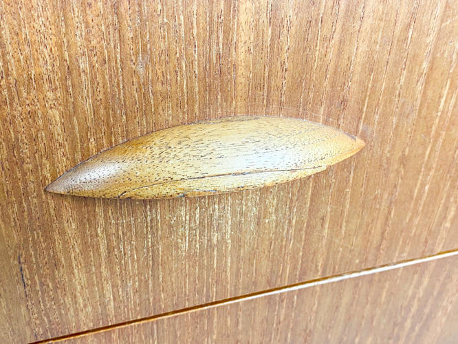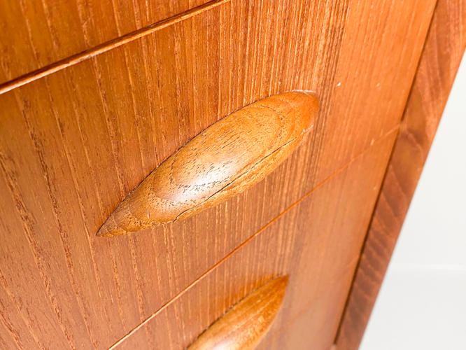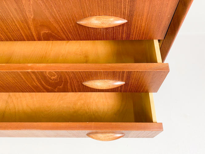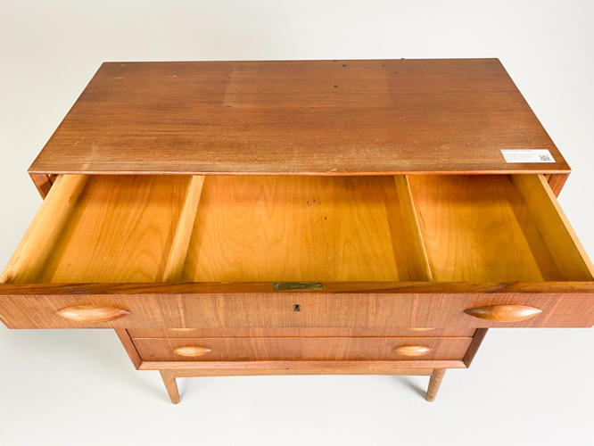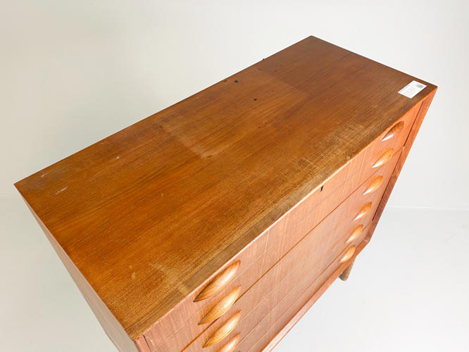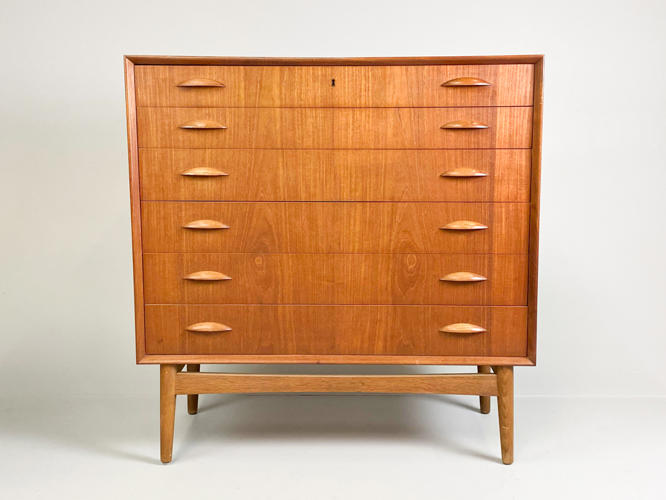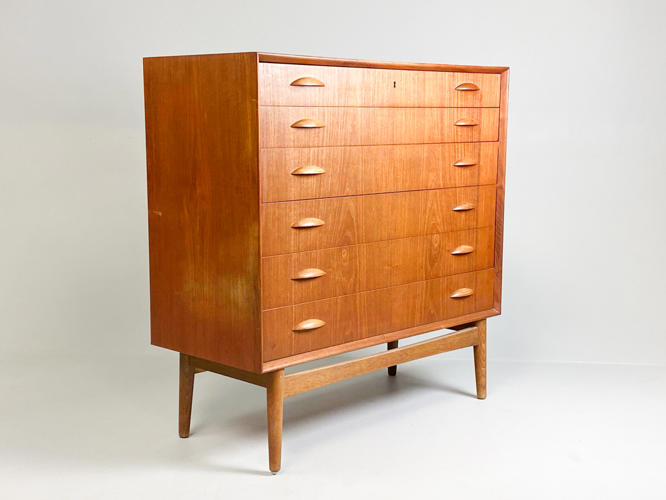 Kommode af teaktræ. Front med 6 skuffer med halvmåneformede greb. Opsat på stel af egetræ med runde let tilspidsede ben. Fremstår med aldersrelateret slid samt én skuffe med reparationer på greb. 100 x 45 x 103 cm.