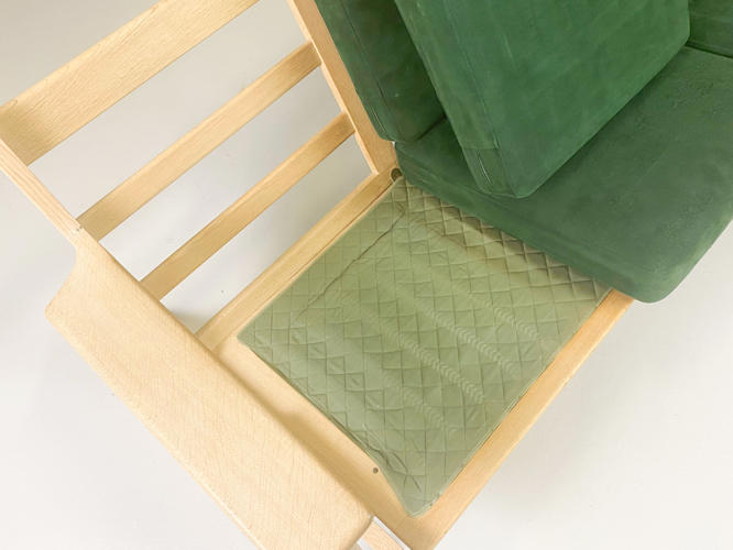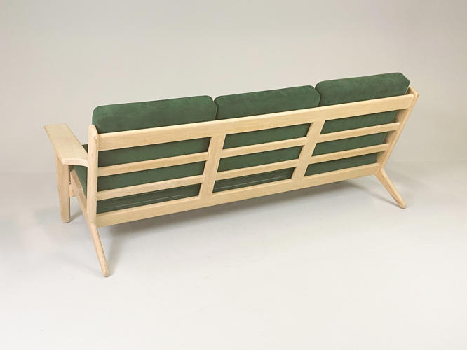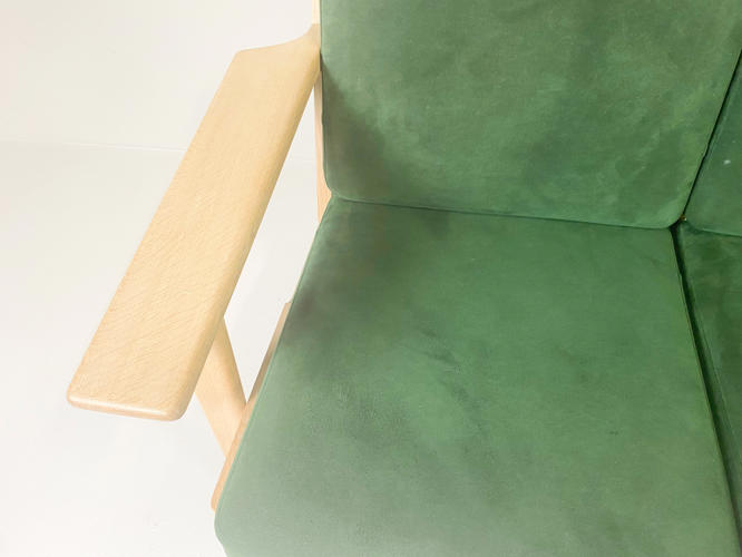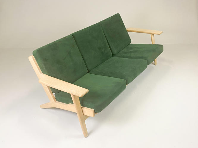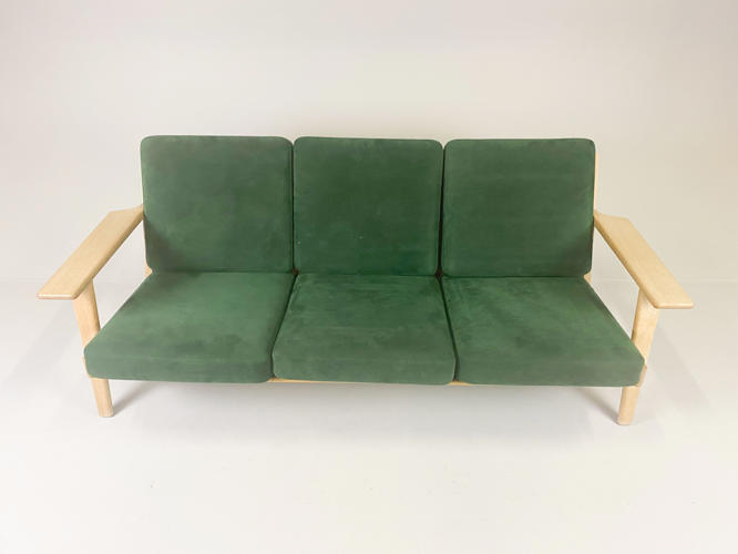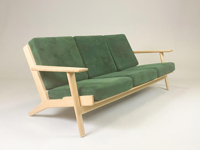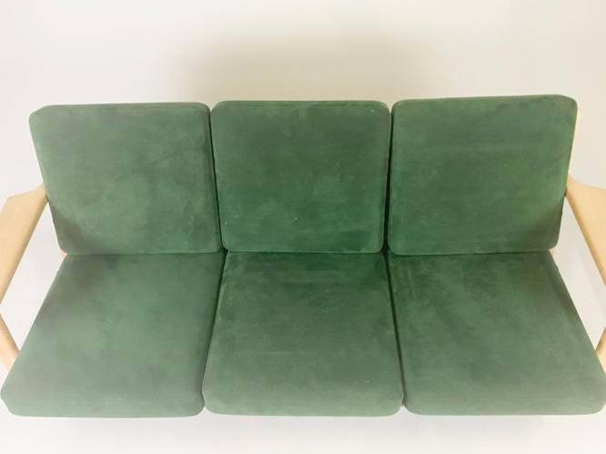 3-personers sofa, model GE-290. Med stel af sæbebehandlet egetræ. Hynder betrukket med grønt alcantara. Produceret hos Getama med brændemærke herfra. Fremstår med minimale brugsspor. L. 180 cm.