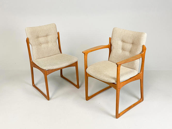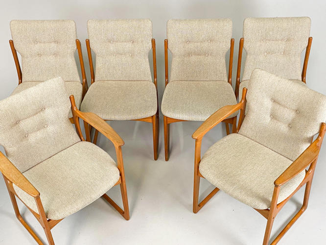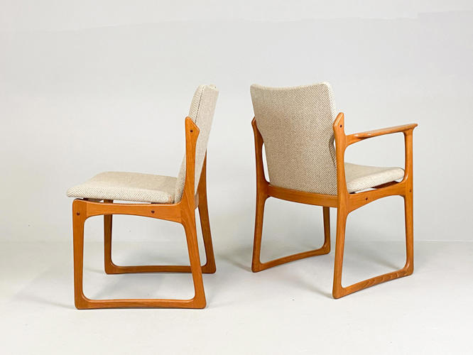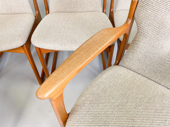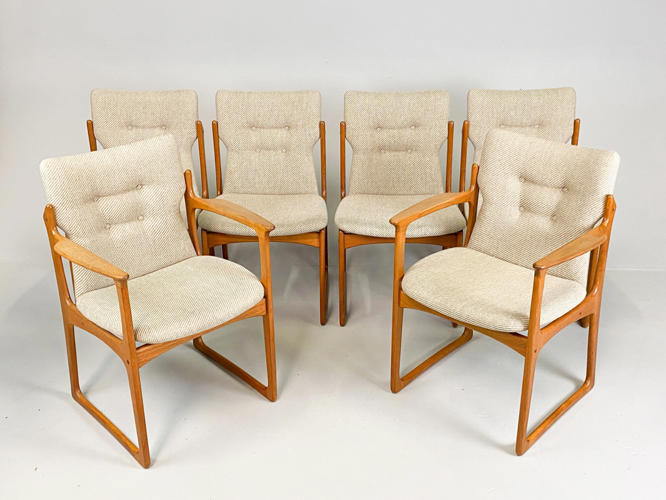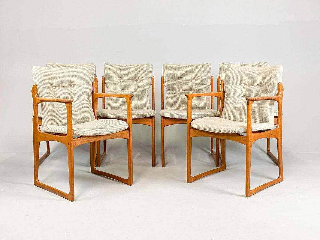 6 spisebordsstole af teaktræ, heraf 2 med armlæn. Betrukket med lyst uld.