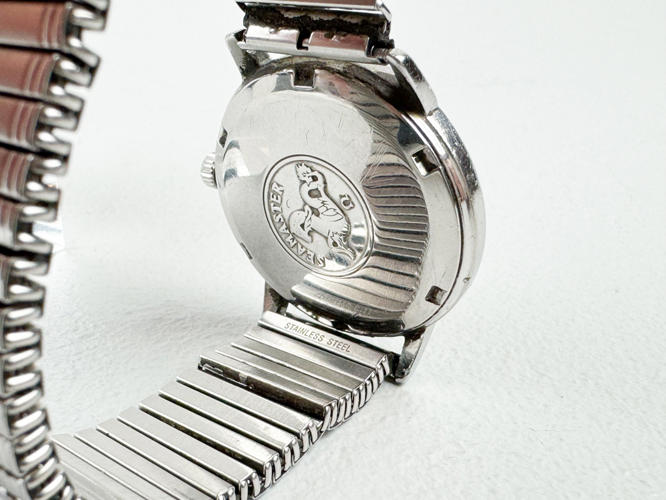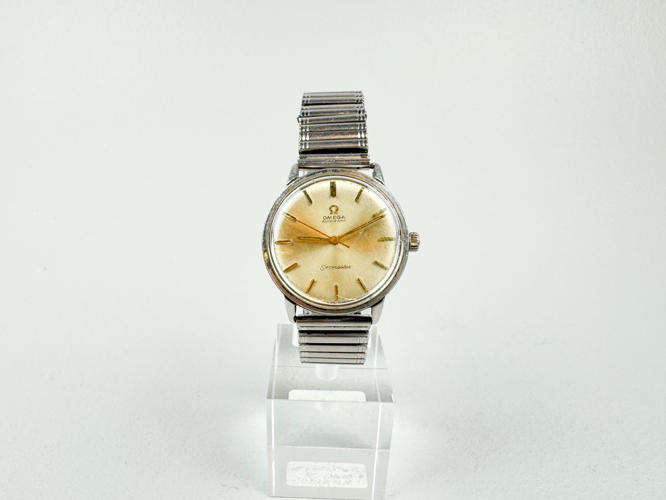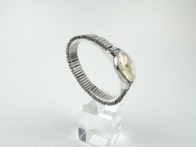 Vintage armbåndsur med kasse af stål. Champagnefarvet skive med gyldne indikatorer. Kassediam. 35 mm. Monteret med flexrem af stål.