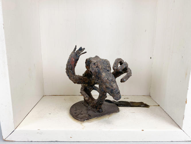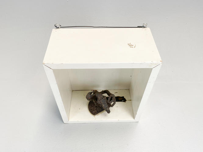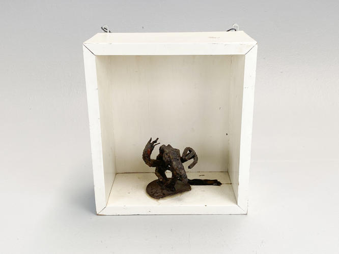 "Adorant". Patineret jern. H. 12 cm. Indsat i væghængt ramme/hylde af hvidmalet træ. 32x28x15 cm. Auktion over kunstværker og kunstgenstande fra Odense Kommune.