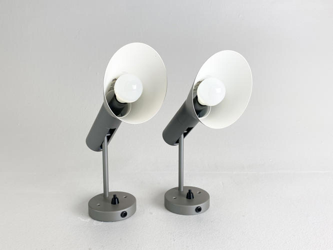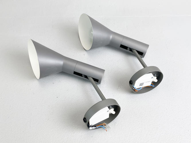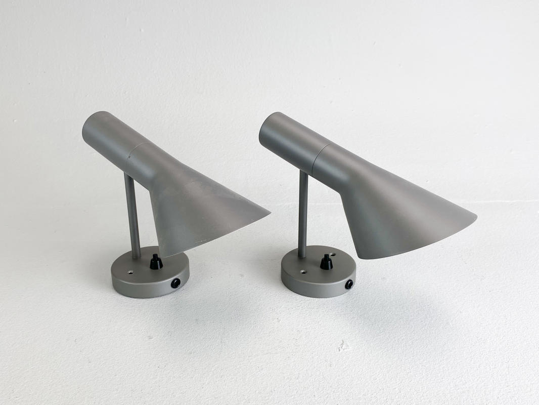 Par AJ væglamper af grålakeret metal. Produceret hos Louis Poulsen. H. 25 cm.