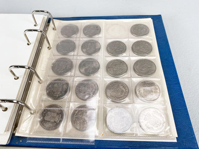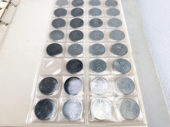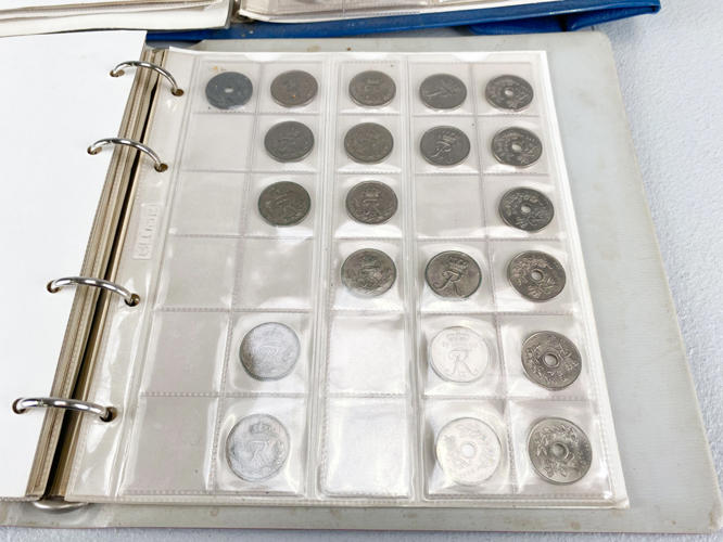 Danmark, gangbar ca. 400kr., 1 øre ca. 1920'erne og frem, 2 øre ca. 1940'erne og frem, 5 øre ca. 1930'erne og frem, 20 kr. ca. 2000 og frem, 21 stk. m.m., hovedsageligt cirkuleret, 2 mapper.