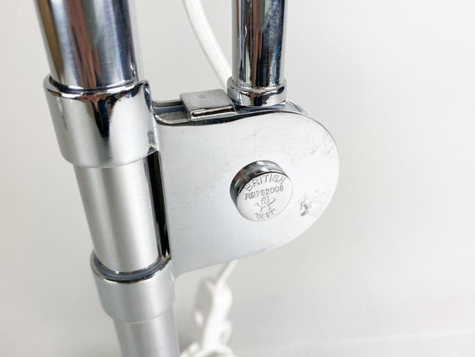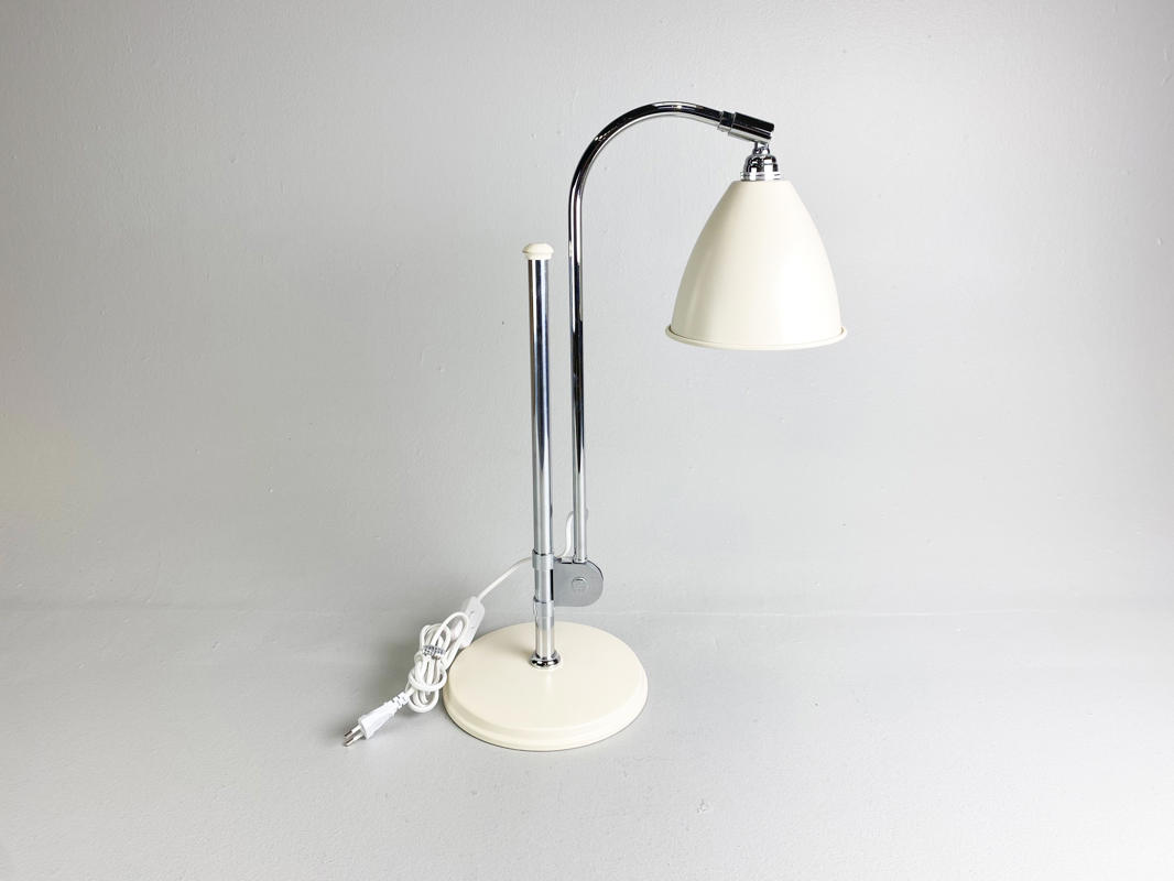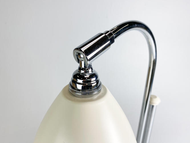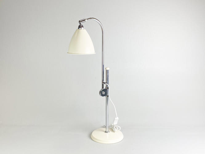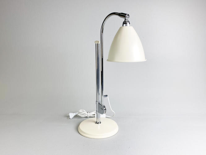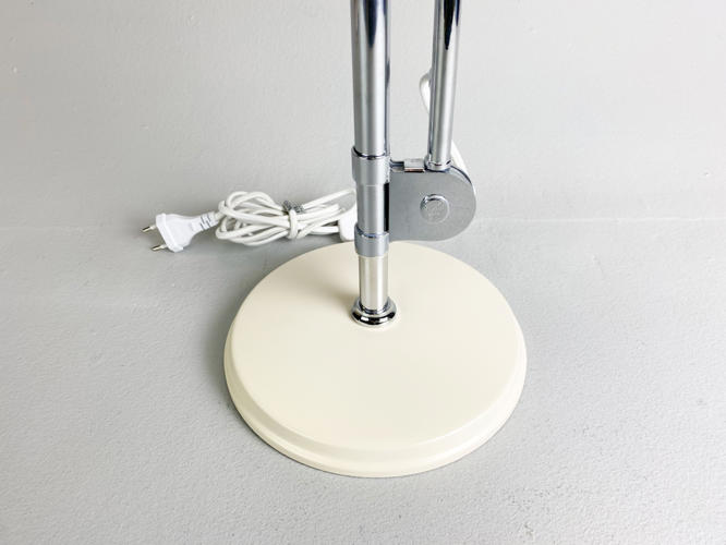 Justérbar bordlampe af forkromet metal. Skærm og fod af lakeret metal. Udført hos Bestlite. H. 52–85 cm., minimale brugsspor