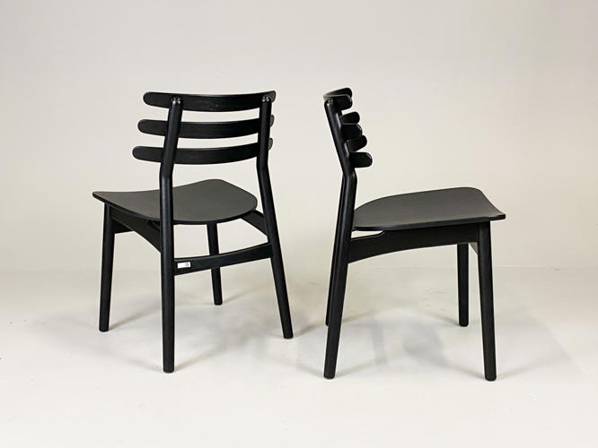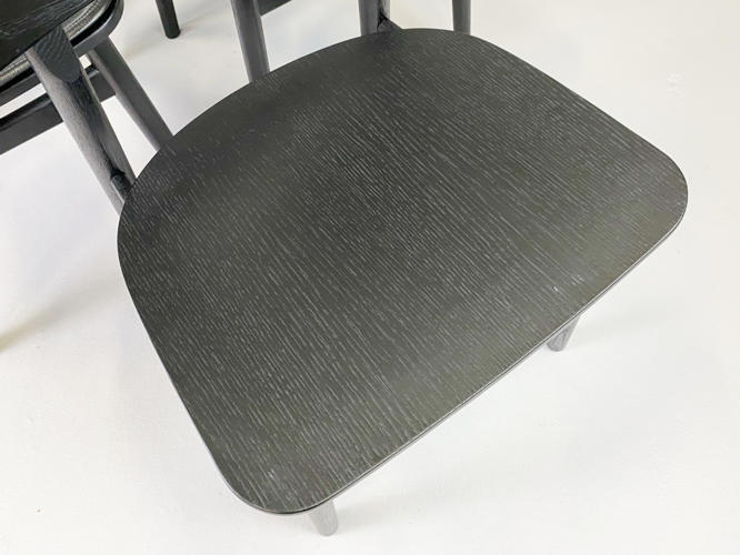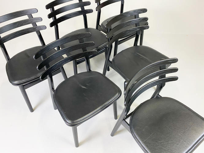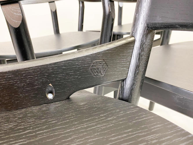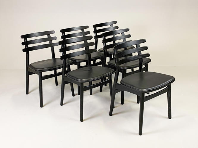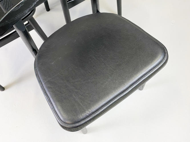 6 spisebordsstole, model J-48. Udført af FSC-certificeret sortlaseret egetræ. H. 78 cm. Sh. 46 cm. Fremstår med minimale brugsspor. Løse siddehynder af sort skind medfølger.