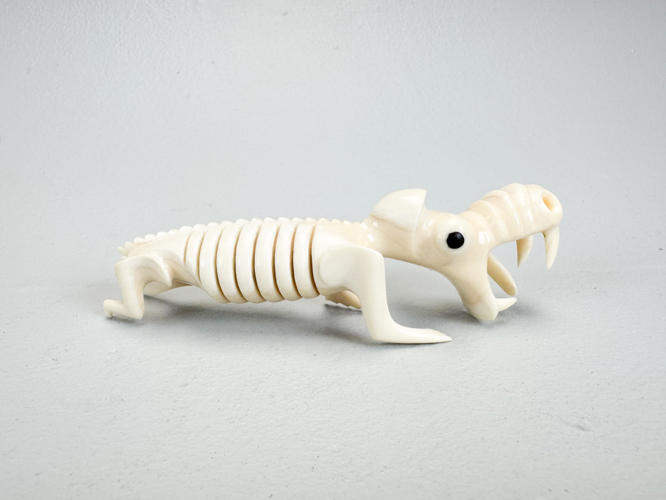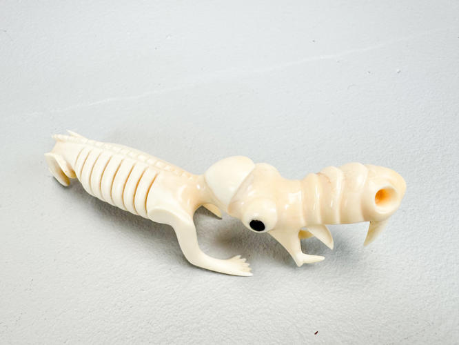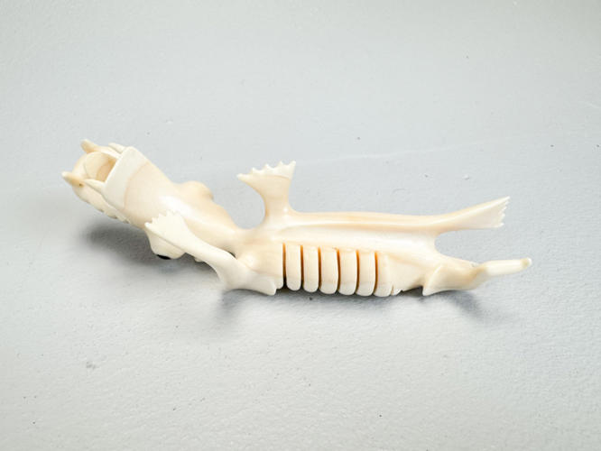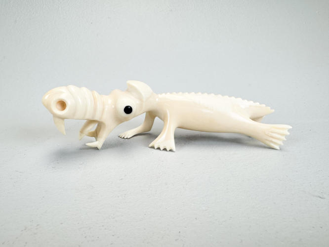 Tupilak i form af fabeldyr. Udført af udskåret kaskelot tand. L. 15 cm. Vægt 99 gr.