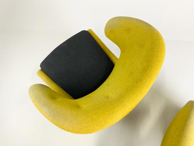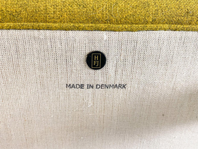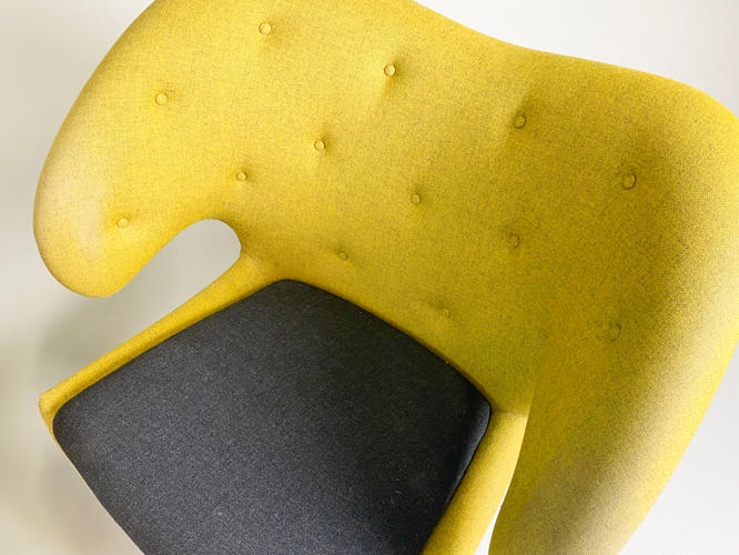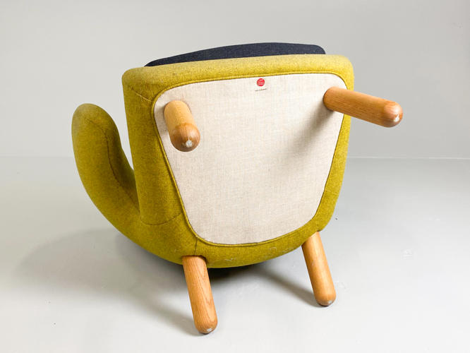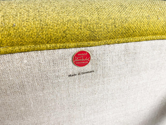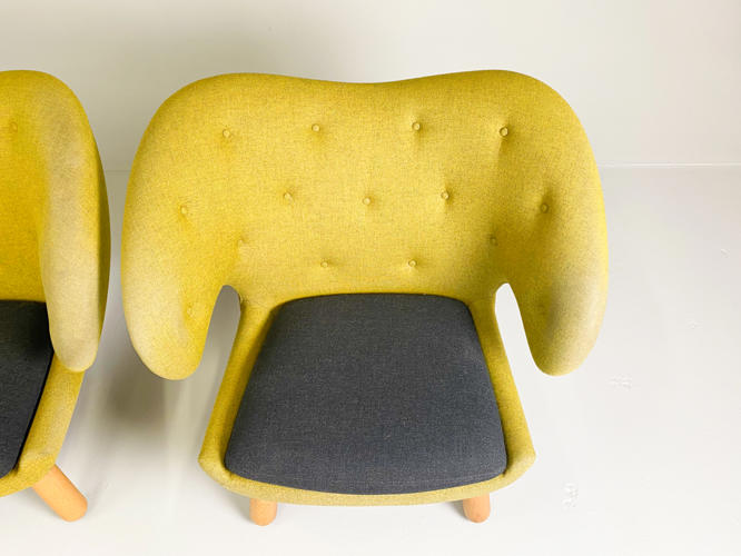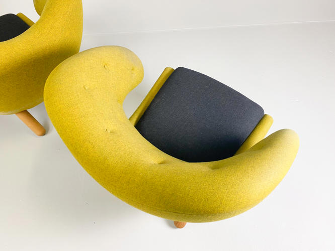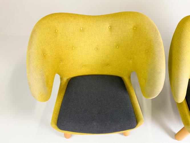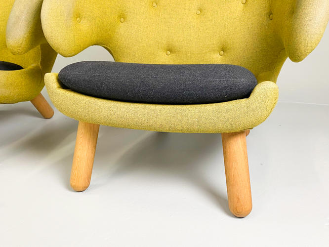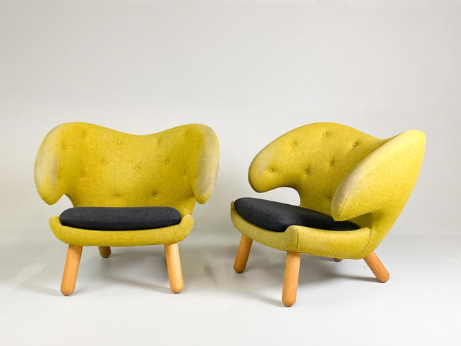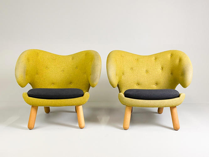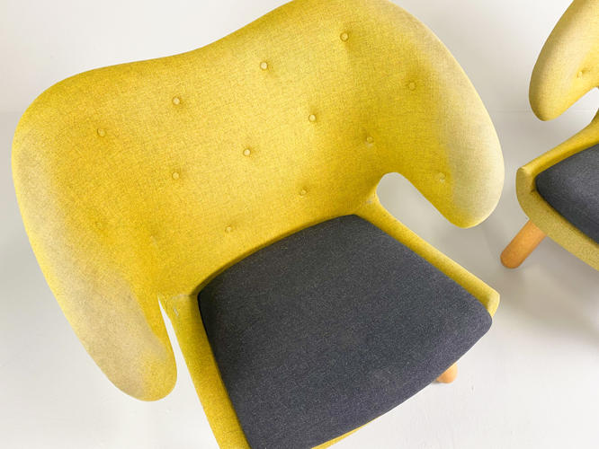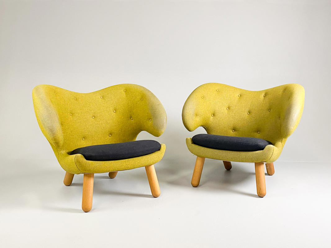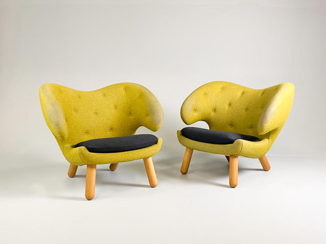 "Pelikanstolen". Par lænestole betrukket med gulligt uld. Dybhæftede i ryggen. Løse sædehynder med mørkegråt uld. Runde ben af massivt egetræ. Produceret hos House of Finn Juhl, med mærkater herfra. Fremstår med aldersrelateret slid samt slidte armlæn.