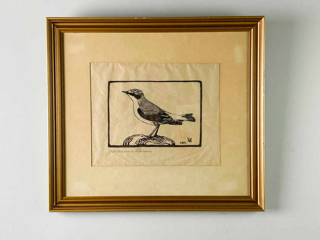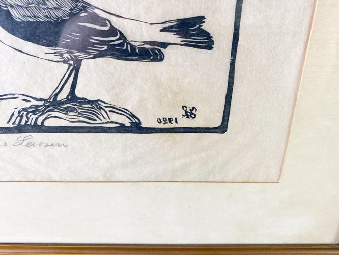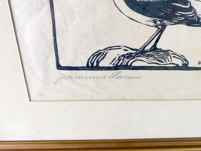"Stenpikker".Træsnit på japanpapir. Signeret Johannes Larsen. Dateret og signeret i monogra i trykket (spejlvendt). Lysmål 19,5 x 24,5 cm.