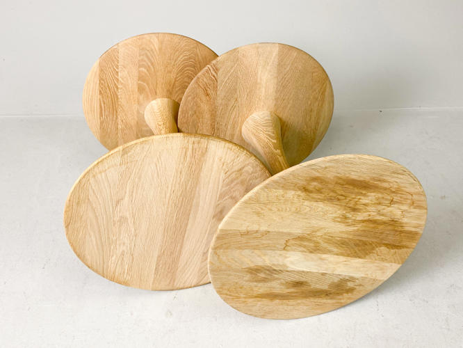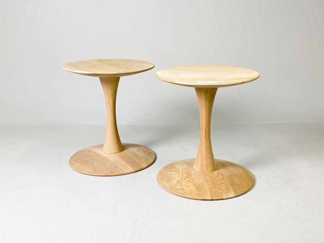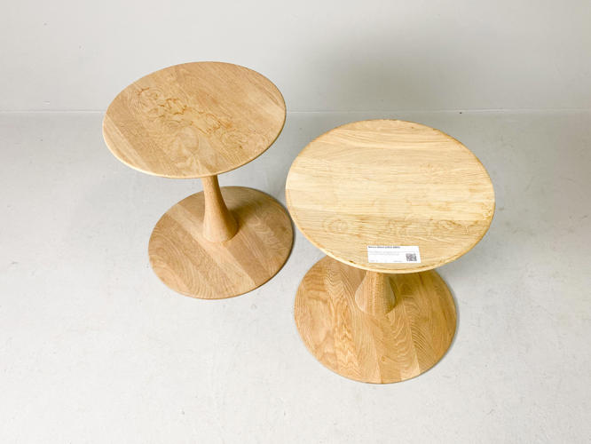 "Trisse". 2 borde af massivt egetræ. Diam. 40 cm. H. 44,5 cm. Plader/bund med fugtskjolder.