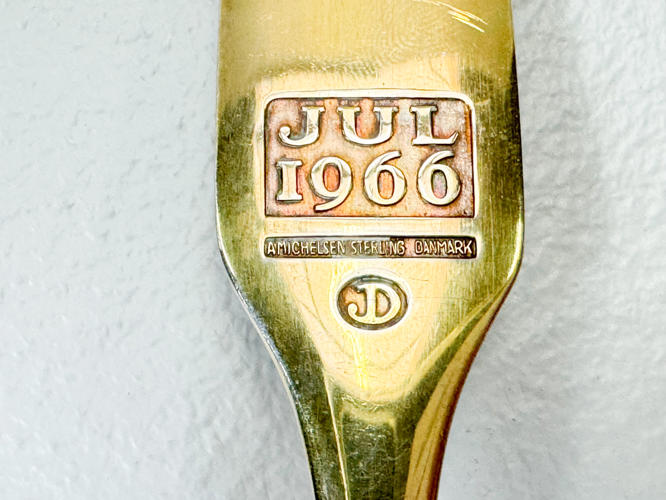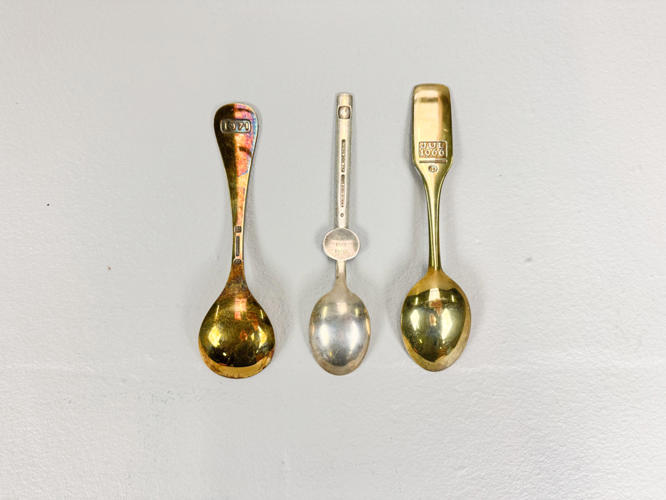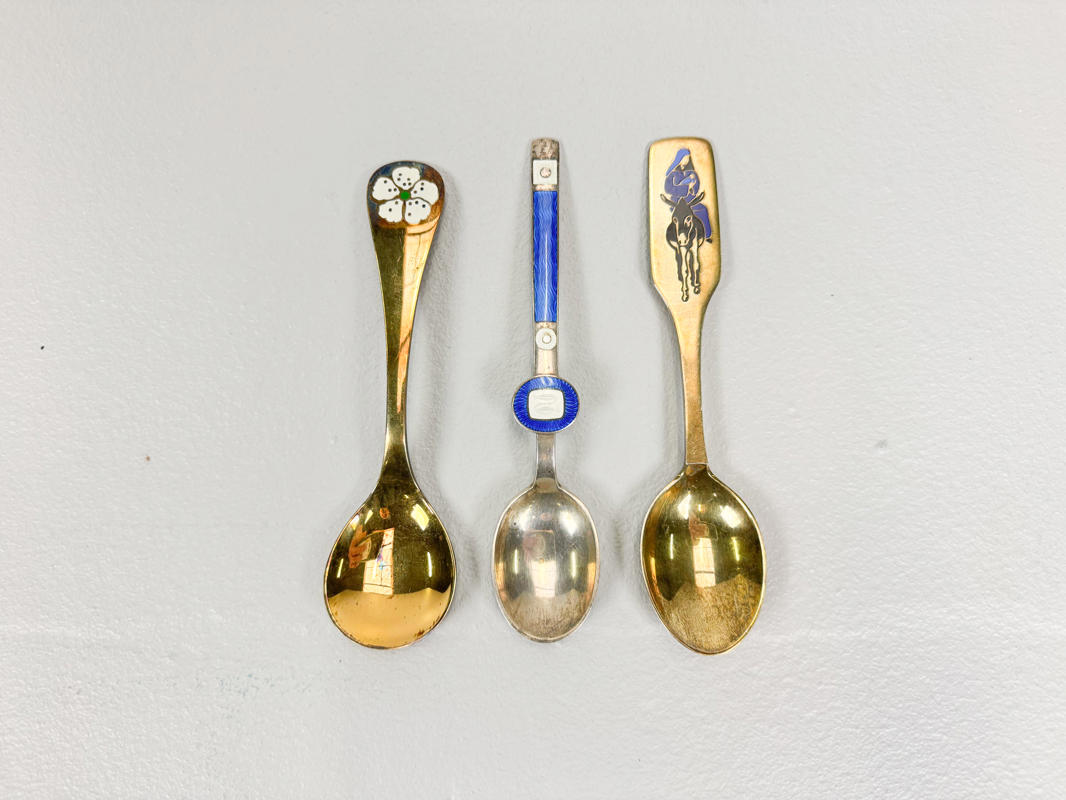3 Års/Juleskeer af sterlingsølv. Julen 1966 og 1971 samt Paul Gauguin ske nr. 3. Prydet med emalje. Totalvægt ca. 127,4 g.