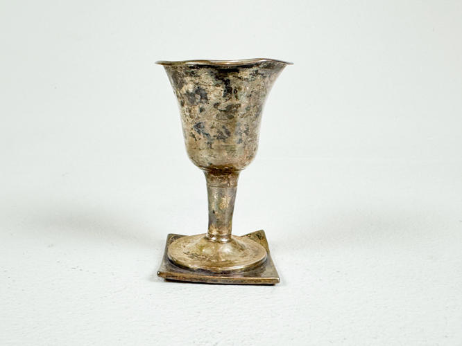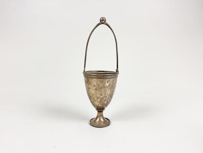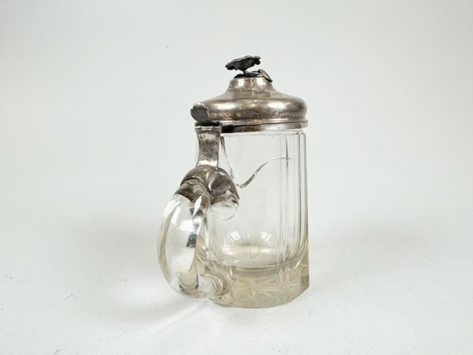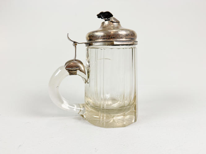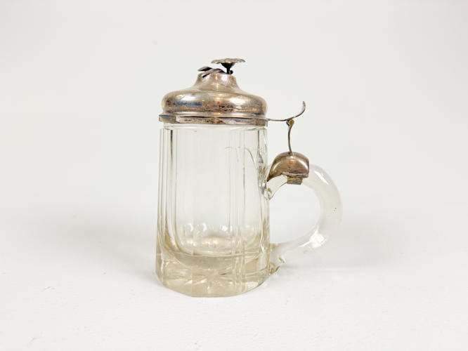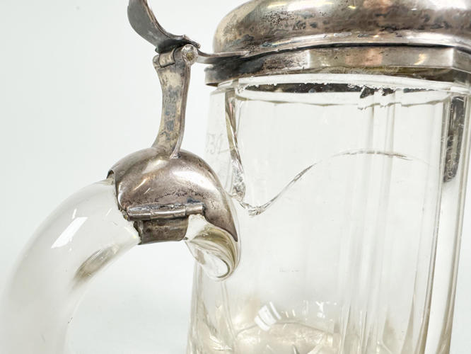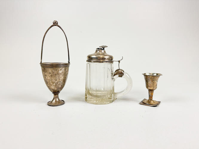 2 bægre af sølv, 830, ét ej stemplet. Lågkrus af slebet krystal med låg af sølv, 830. H. 8,5 - 22 cm.