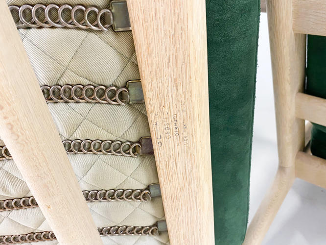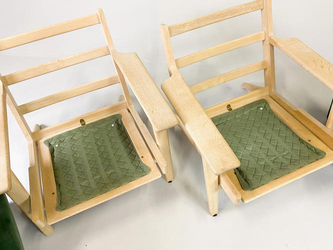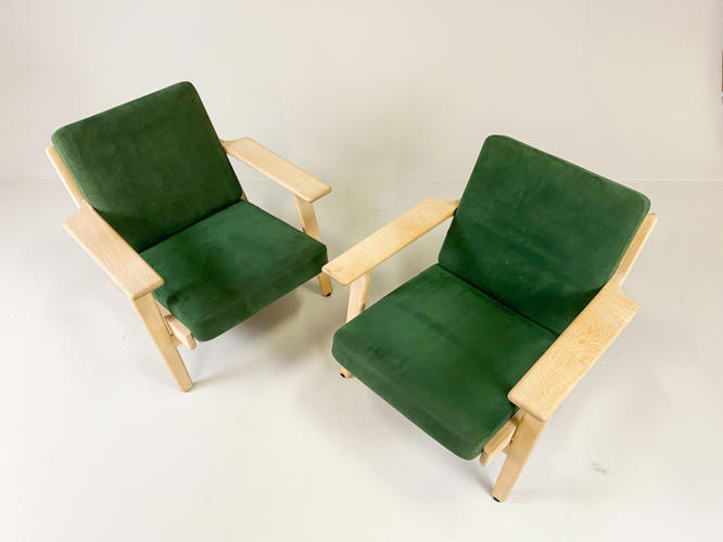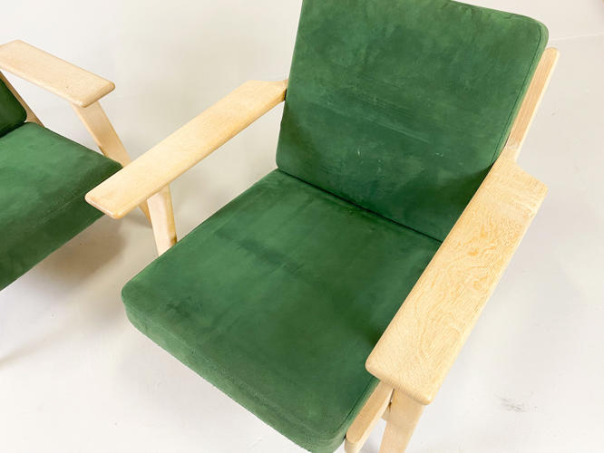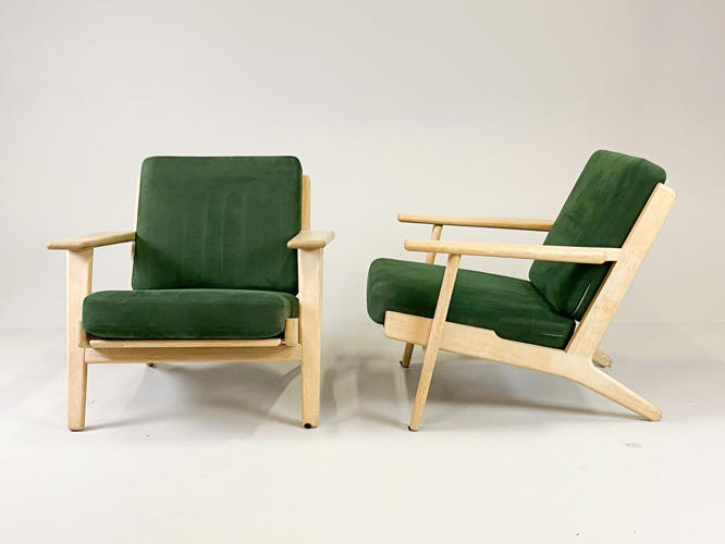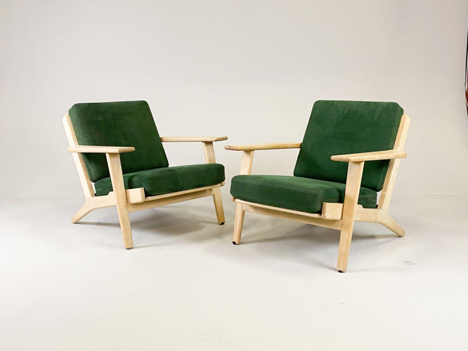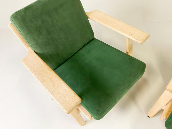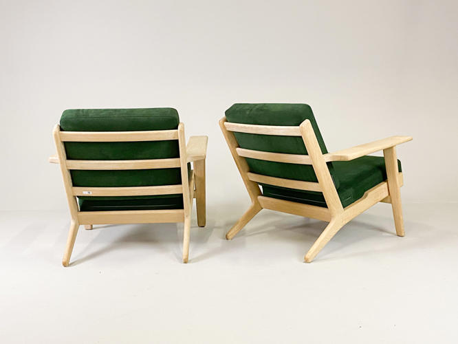 Par lænestole, model GE-290. Med stel af sæbehandlet egetræ. Hynder betrukket med grønt alcantara. Produceret hos Getama med brændemærker herfra. Fremstår med minimale brugsspor.