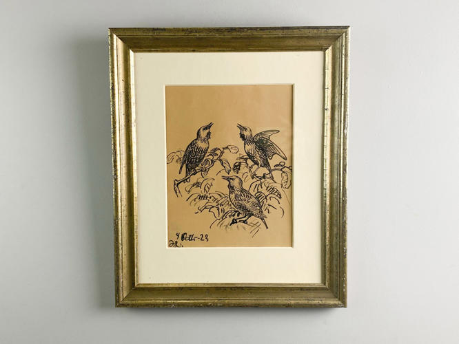 3 fugle på grene. Signeret i monogram 4 Okt–23. Pen på papir monteret i passepartout i gammel sølvramme. Lysmål 22,5 x 18,5 cm.