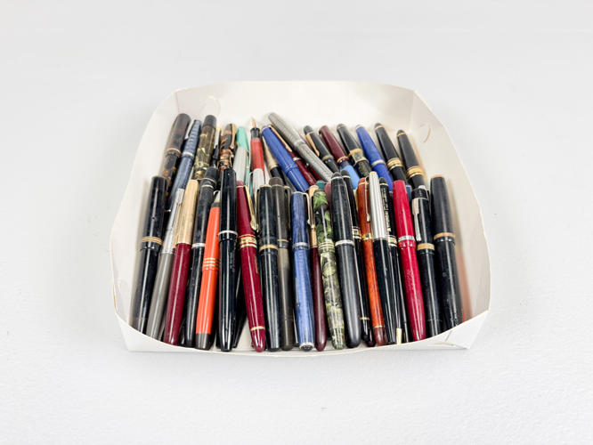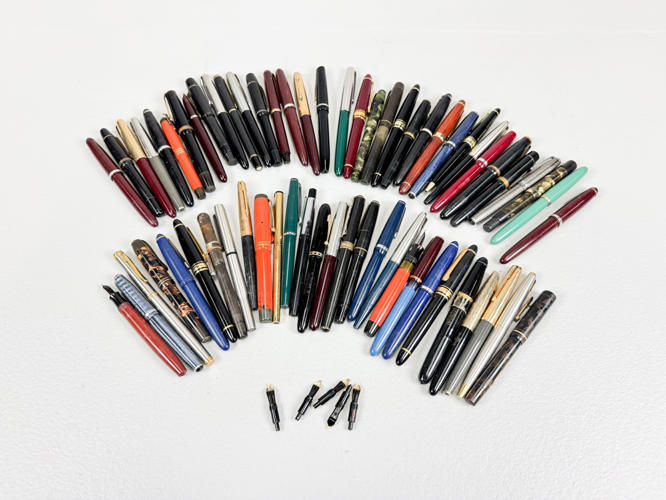 60 Fyldepenne hovedsageligt med spidser af metal, utydelige stempler, fremstår med defekter samt slid og brugsspor.