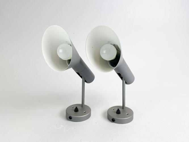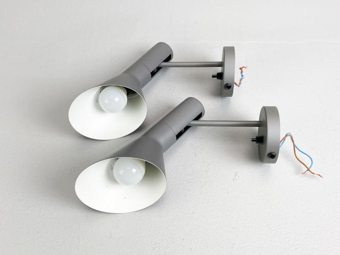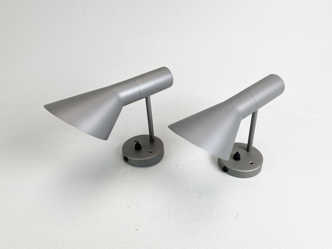 Par AJ væglamper af grålakeret metal. Produceret hos Louis Poulsen. H. 25 cm.