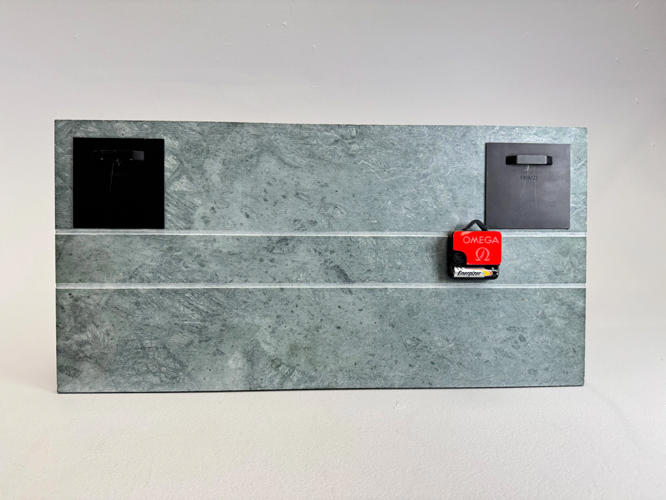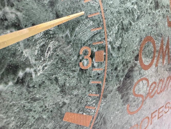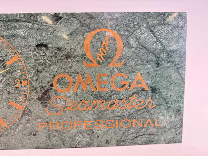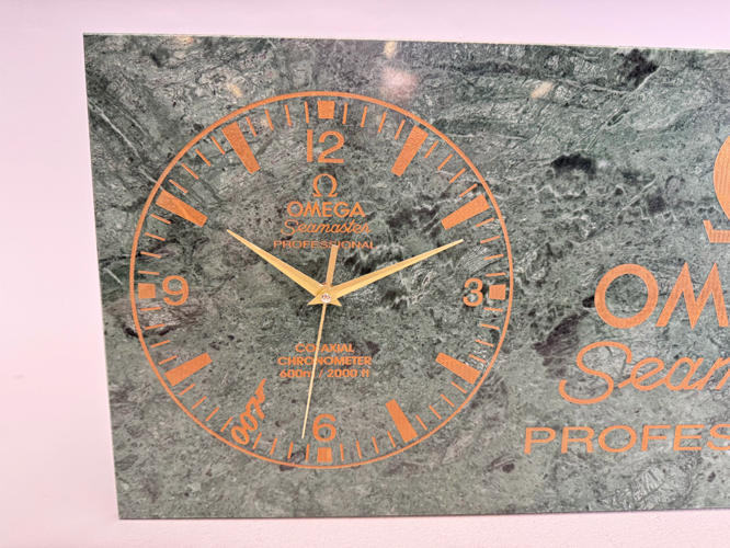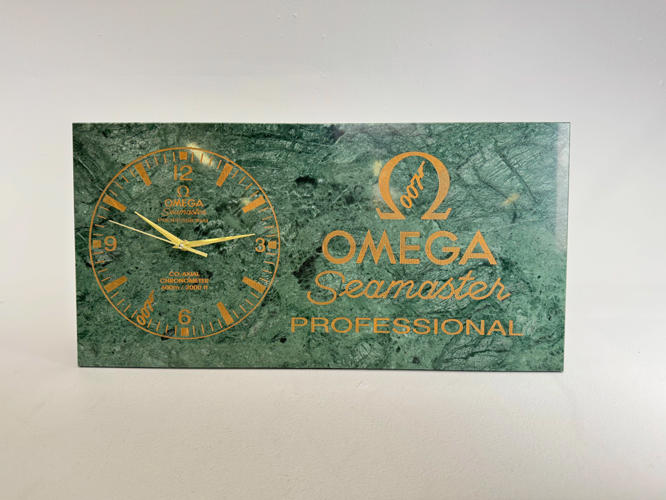 Vægur af grønt marmor. Urskive og plade dekoreret med fræsede guldstafferinger. "Omega 007 Seamaster Professional". Batteridrevet ur med teksten "Omega Seamaster Professional co-axial chronometer 600m/2000ft. 610 x 305 x 10 mm.