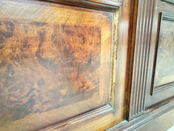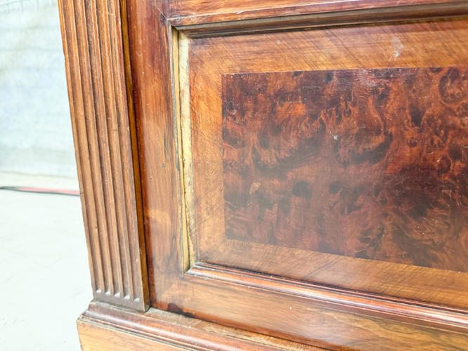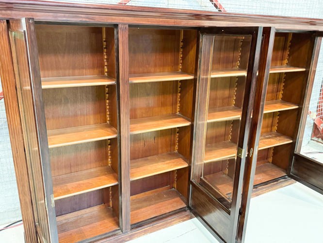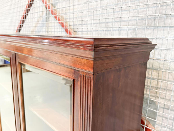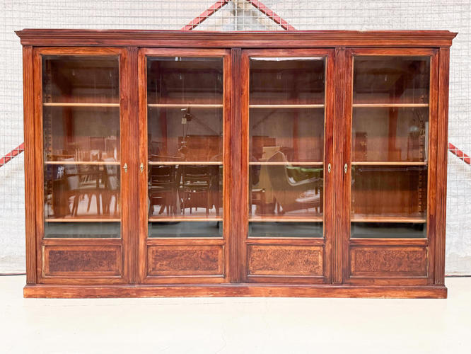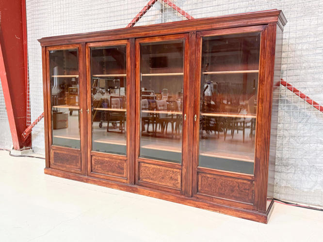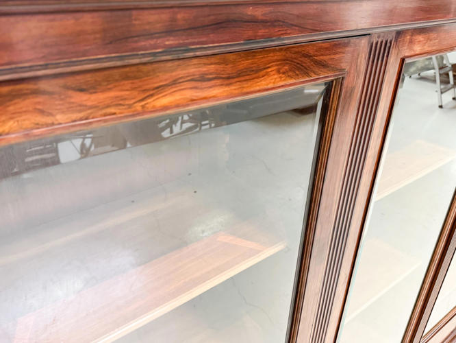 Vitrineskab af palisander med nødderods detaljer, front med fire låger monteret med facetslebet glas, fremstår med enkelte defekter i form af manglende lister. 258 x 38 x 160 cm.