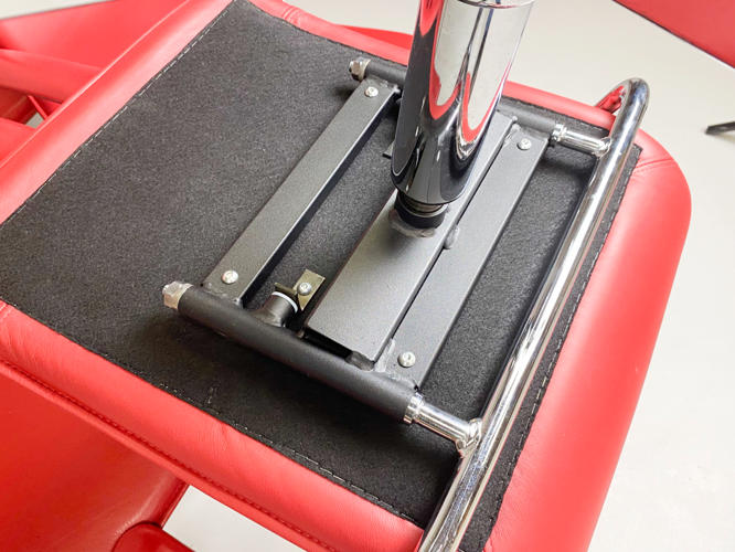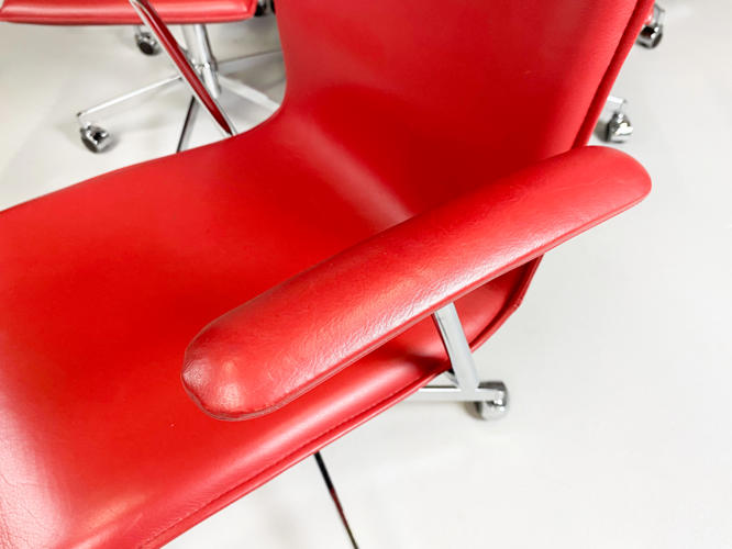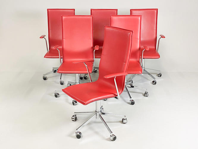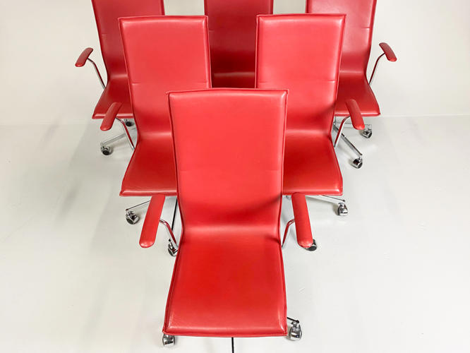 6 kontor / konferencestole betrukket med rødt skind, drejelig fempasstel af forkromet metal med returdrej, afsluttet på hjul. Sh. 45 cm. Fremstår med få brugsspor.